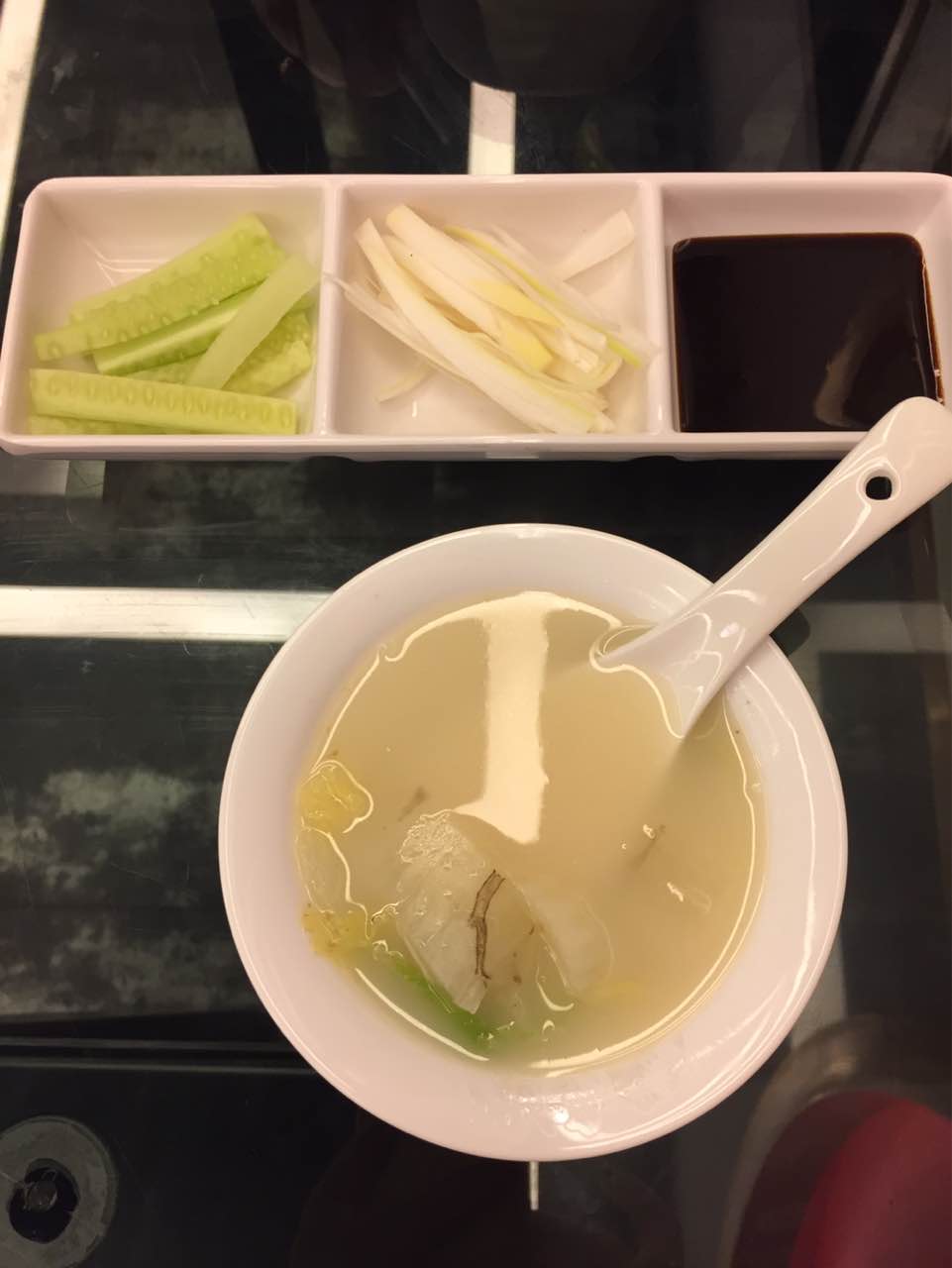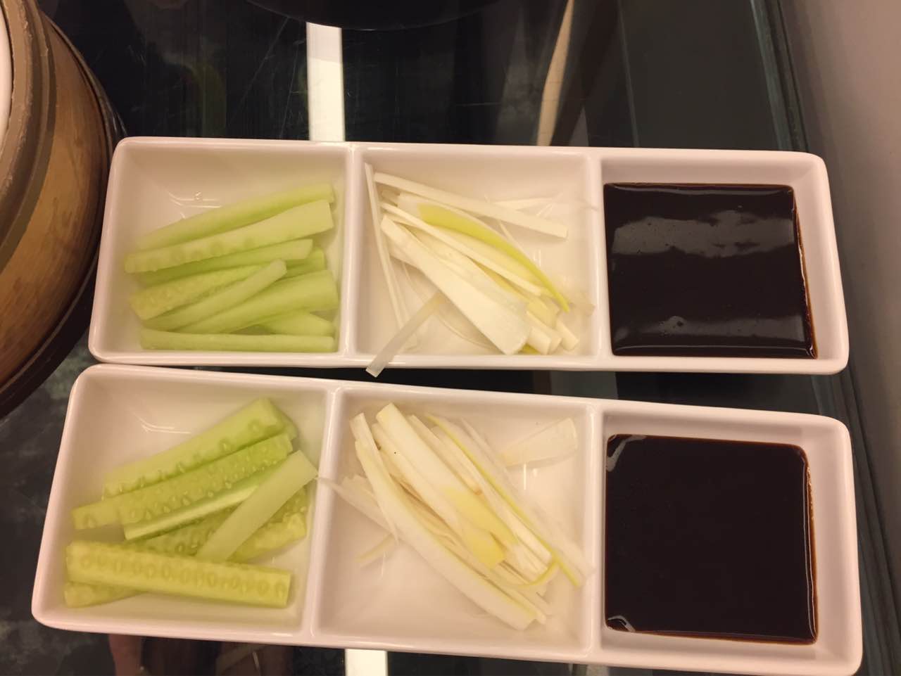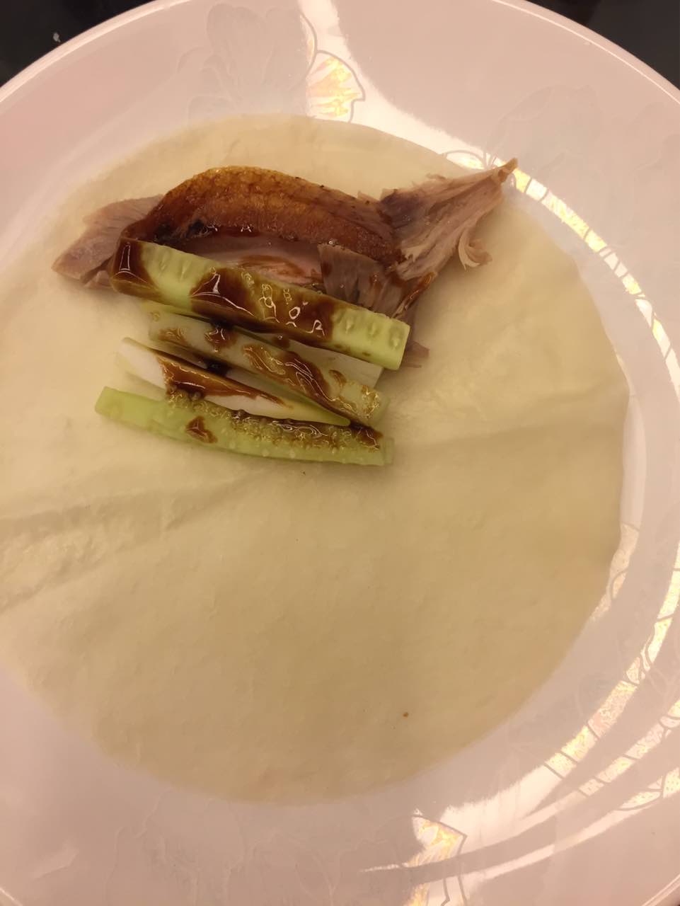 鸭汤浓稠,鸭子香酥油而不腻,沾上酱料,配上大葱及小黄瓜条吃香浓咸淡适口。