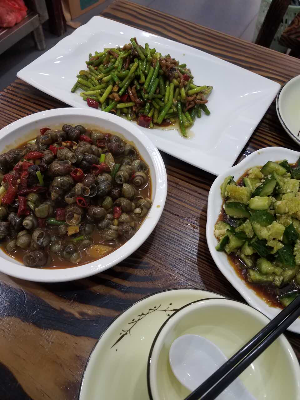 蒜苔炒肉分量少。田螺炒得不熟。