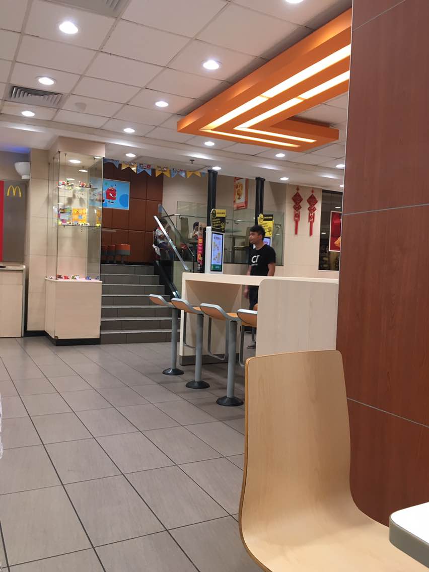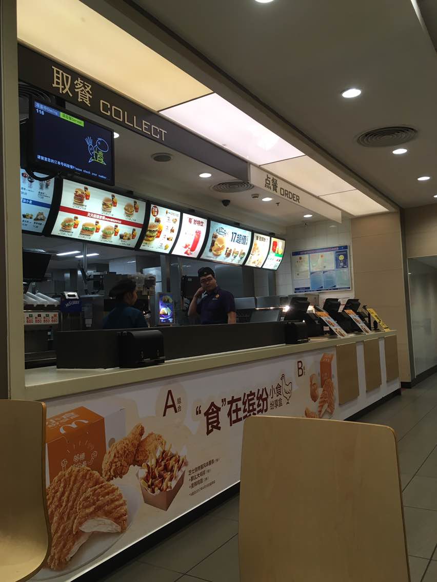环境干净整洁。服务及时周到,然后买不辣的鳕鱼堡套餐并有提供开水很温馨,可支付宝买单。