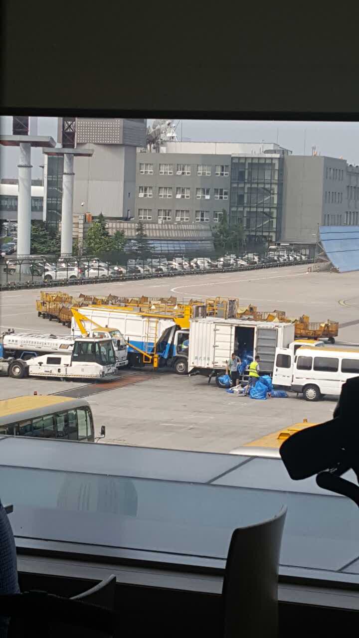地方有点小,高峰时没有座位。窗外面是忙碌的装卸工人。