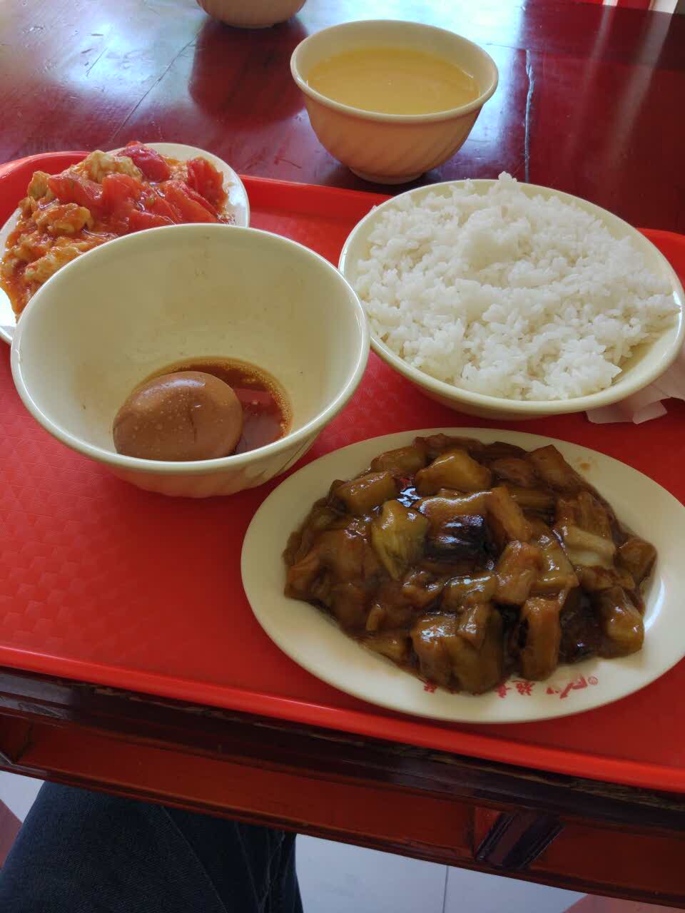 一顿11.5,土豪卤蛋,西红柿炒鸡蛋,红烧茄子,香米饭,免费玉米粥,够不够二十字了???