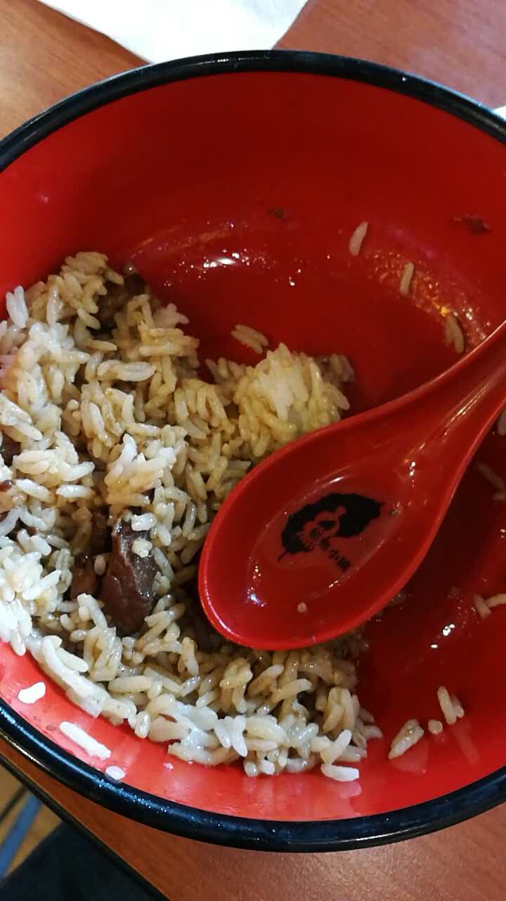 卤肉饭,肉末盖饭。味道还可以接受,菜少,就一个卤蛋,和三四条10公分黄瓜。送了一个虾米汤,汤口可以。