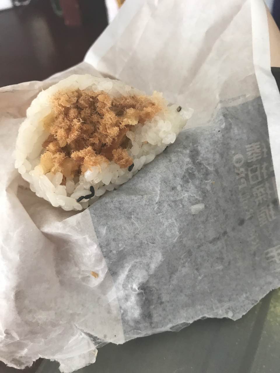 里面油条、肉松、应该还有榨菜之类的,都是有盐的,放一起太咸,米就薄薄的一层,可以米多一些,榨菜...肉松的饭团太咸了,里面油条、肉松、应该还有榨菜之类的,都是有盐的,放一起太咸,米就薄薄的一层,可以米多一些,榨菜少一点综合一下就好了。冰豆浆可以。