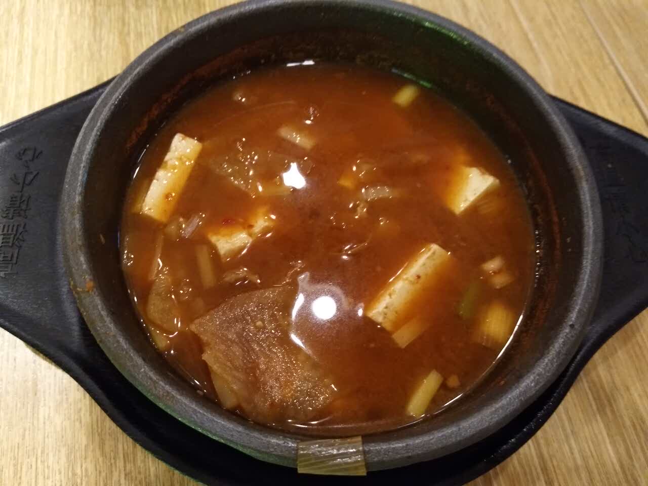 这家的大酱汤不怎么样,料放的太少,就有少许的豆腐、西葫芦片、土豆片、洋葱丁,3粒牛肉粒,放的最多的就是葱花,汤喝着还有膻味,连最基本的蘑菇也没有,不推荐。正一味的店没有统一标准,每个店的味道都不一样。