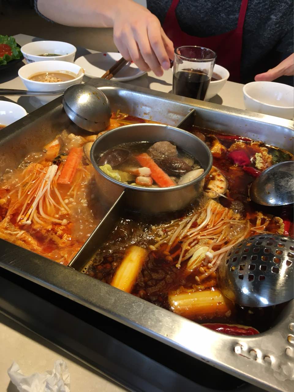 服务太好了 等座的时候有人引导去水果自助区 还有扑克牌和五子棋可以玩 入座准备开吃的时候地给我们热毛巾围裙还有眼镜布和两个自封袋 说是手机可以放进去防潮的 火锅味道不错一份菜品的量也不小 去厕所的时候阿姨还给我挤了洗手液帮我开手龙头!感动到了 厕所里还有卷纸和姨妈巾。唯独一点就是酸梅汤豆浆的自助有点坑,自助调料区有热粥,我们也就总共要了一杯酸梅汤一杯豆浆。还有水果可以再多一点点就好了 总之五星好评 以后还会再来。