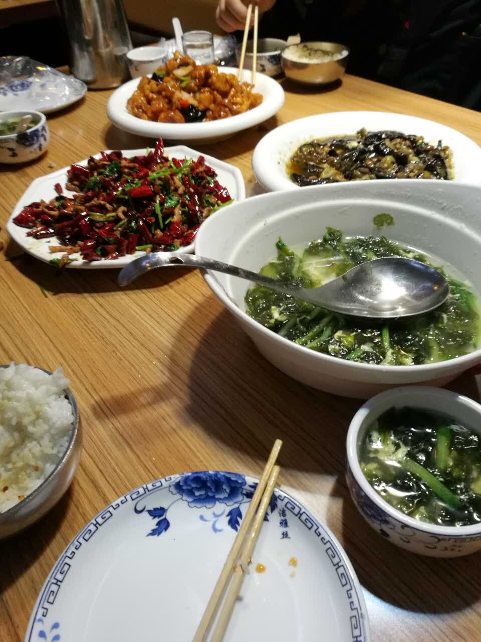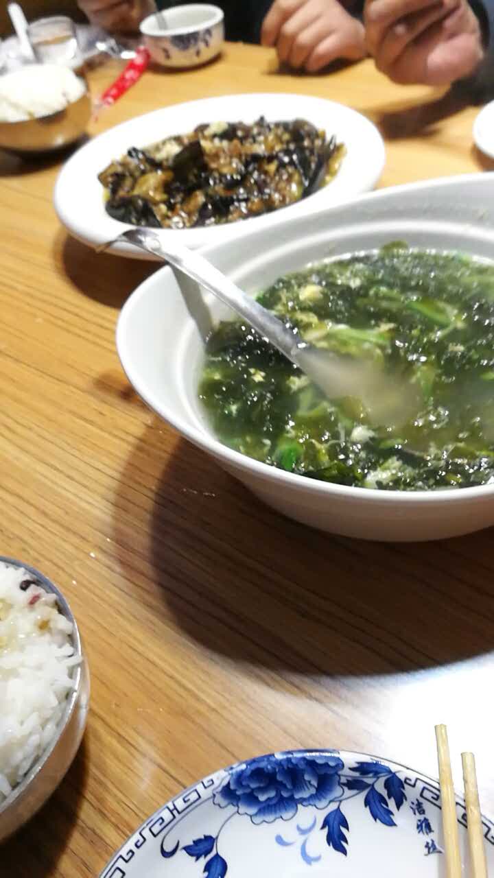 香辣肉丝,紫菜蛋花汤,樱桃肉,肉末茄子,味道不错,都是喜欢吃的