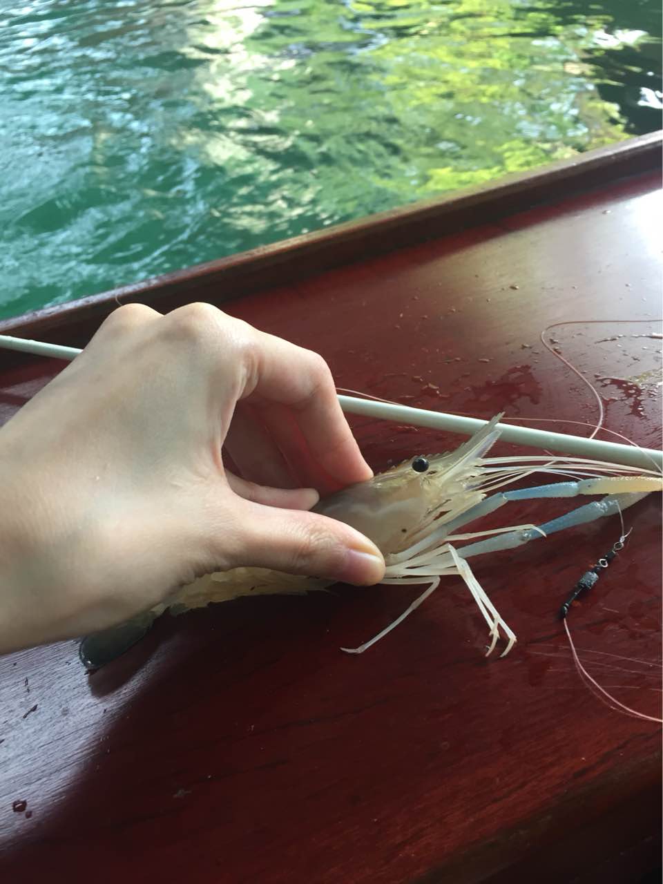 教大家一个钓虾技巧:饵料必须小于虾嘴的宽度.最好的大小约半颗米饭即可.太小了不容易钩牢
