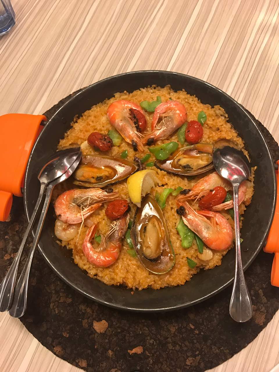 人不是很多,适合家庭用餐,喜欢吃芝士底海鲜大狂欢披萨和西班牙海鲜饭!