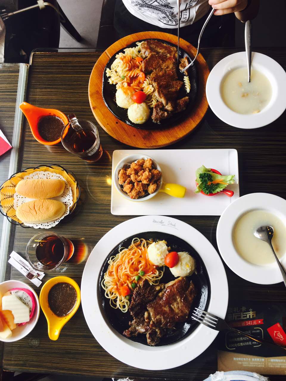 另有免费水果附送,吃完正餐后可去水果区选一些水果品尝,水果都非常新鲜,味道很赞每次回宁乡必来这家店,牛排肉质鲜嫩、味道不错,配送免费的汤、茶水和面包,个人觉得汤喝茶水味道一般。炸的鸡米花香脆可口。另有免费水果附送,吃完正餐后可去水果区选一些水果品尝,水果都非常新鲜,味道很赞。