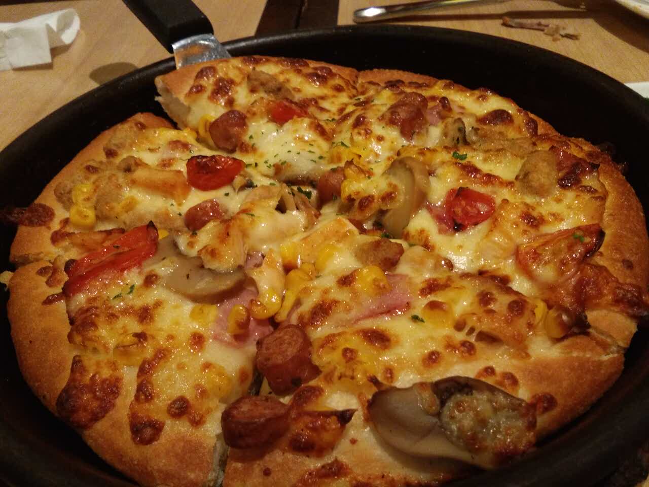 儿子就是必胜客的常客,这么多三个人吃光了,嘿嘿嘿嘿,饭量太大了怎么办