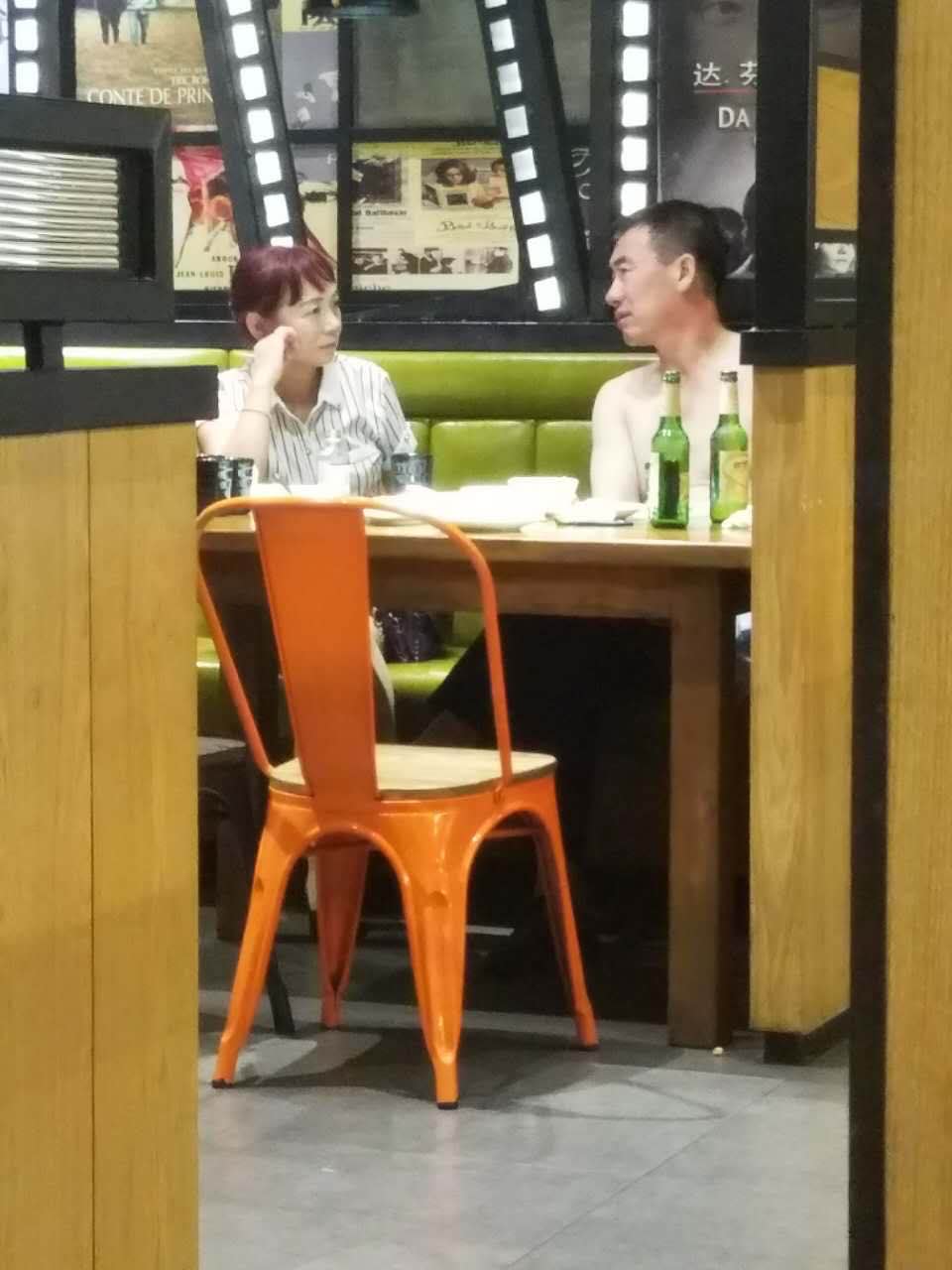 居然有人光着膀子吃饭,服务员也不制止,头上空调机还滴水