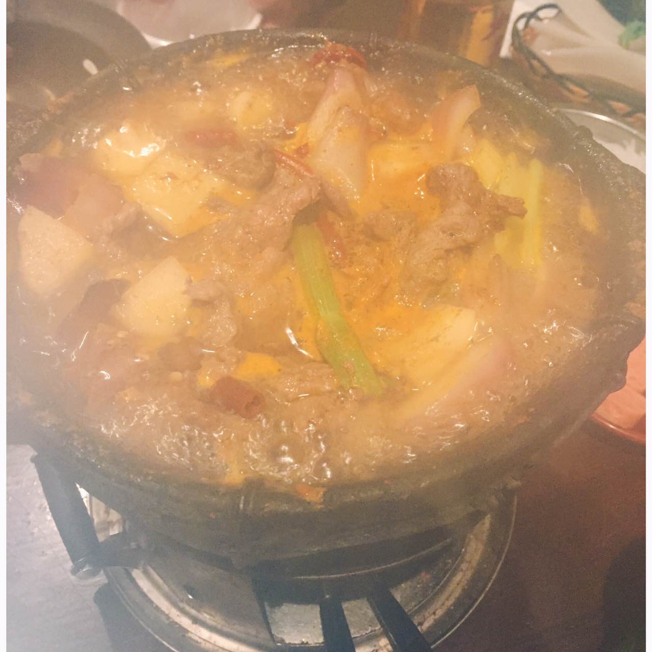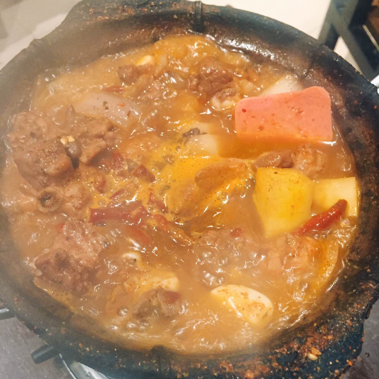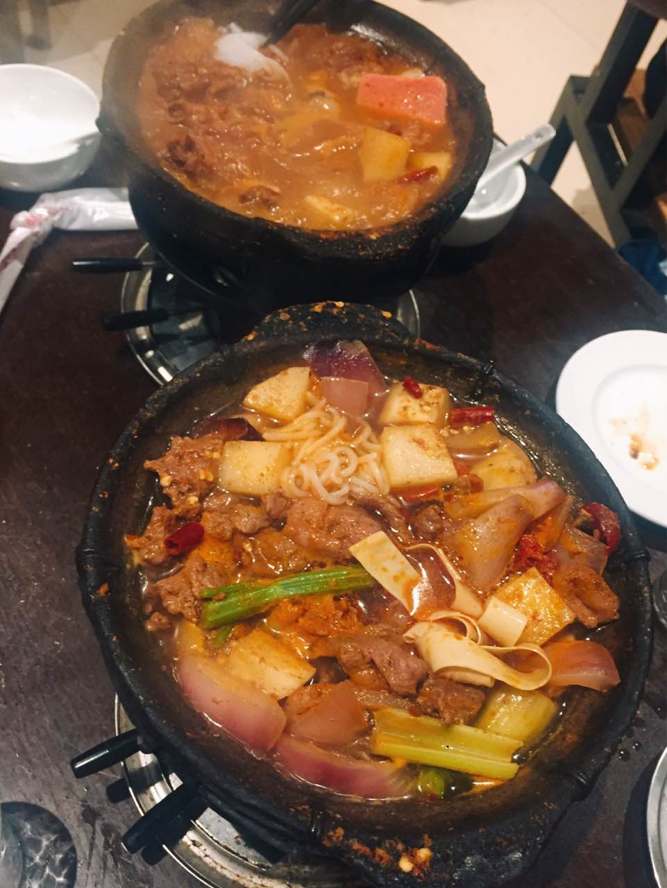 来了好几次了这次终于想起来写点评哈哈!大热天吃鸡公煲也是真爱了,小店环境很嘈杂很乱,桌子地面也很油,但是生意超好,6、7点阿里基本上都要等位了。因为不吃兔子和牛蛙,也不爱吃鸡,所以就点了牛肉煲和排骨煲,牛肉煲超好吃是我的最爱,肉片很嫩软滑,排骨煲的肉偏硬一点。这里啥都是“自助式”,哈哈,凉菜涮菜饮料自己拿,北冰洋自己拿桌子上的瓶起子开,甚至连加汤顾不过来我都是自己加了。然后就强调一点吧,不能吃辣的人千万不要点中辣!!!我觉得我还是一个比较能吃辣的人真的也吃不了中辣的,真的太辣了,微辣这种带点辣味还尝得出来别的食材的味道是最好的!关于配菜呢,个人很喜欢午餐肉和烙饼,因为火不是太旺,像藕或西兰花这种可能煮不烂,这个要注意一下。最后就是真的好吃,而且不贵~俩人吃3、40左右足够了。