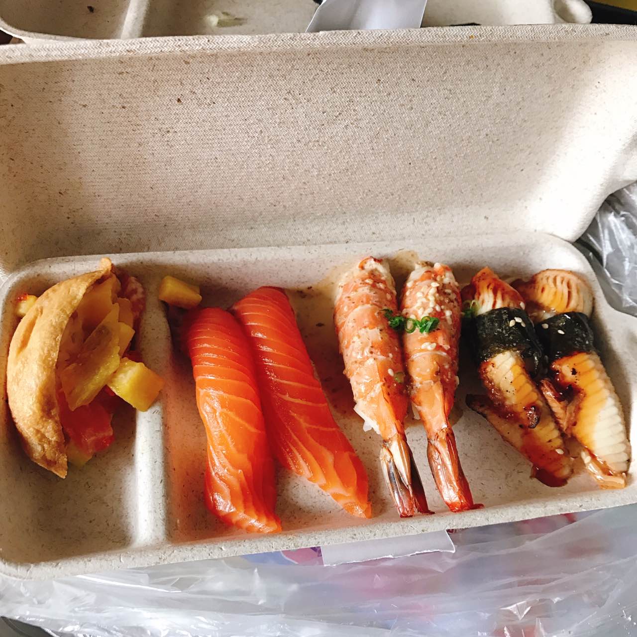 外带,点了火炙三文鱼然后没火炙。芝麻虾和鳗鱼好吃。