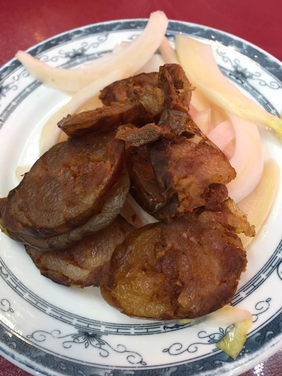 ...一顿饭~跷脚牛肉,看到旁边桌有腊肠很诱人,原来是人家的工作餐,老板娘自己做的,很好吃,肥而不腻
