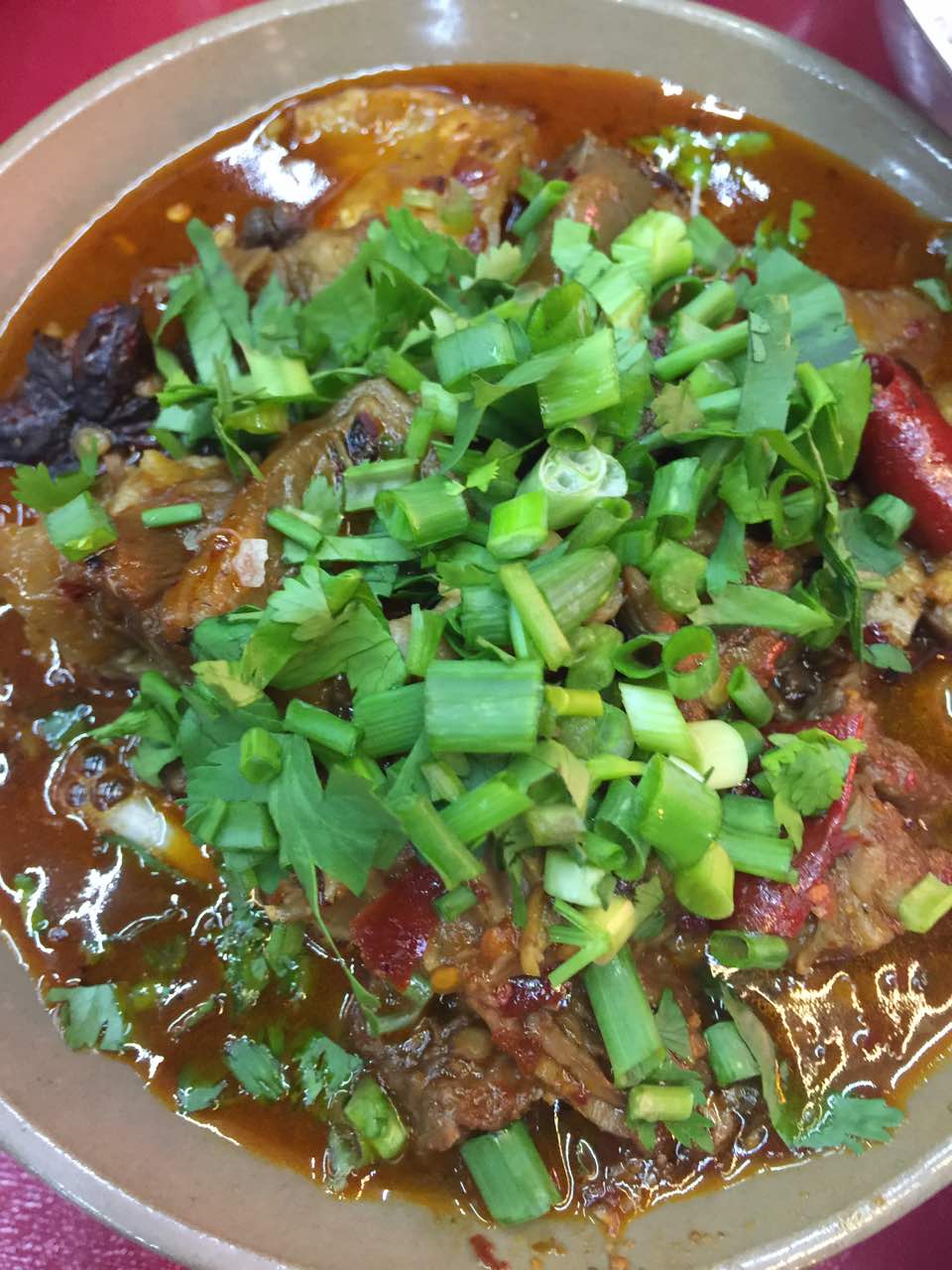 这是到四川最满足的一顿饭~跷脚牛肉,看到旁边桌有腊肠很诱人,原来是人家的工作餐,老板娘自己做的,很好吃,肥而不腻。老板娘看我很想吃,非让我夹了很多过来[呲牙]跷脚牛肉汤很好喝,红烧的牛杂味道也够浓。