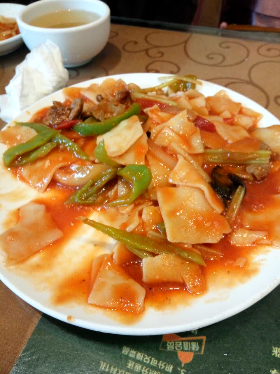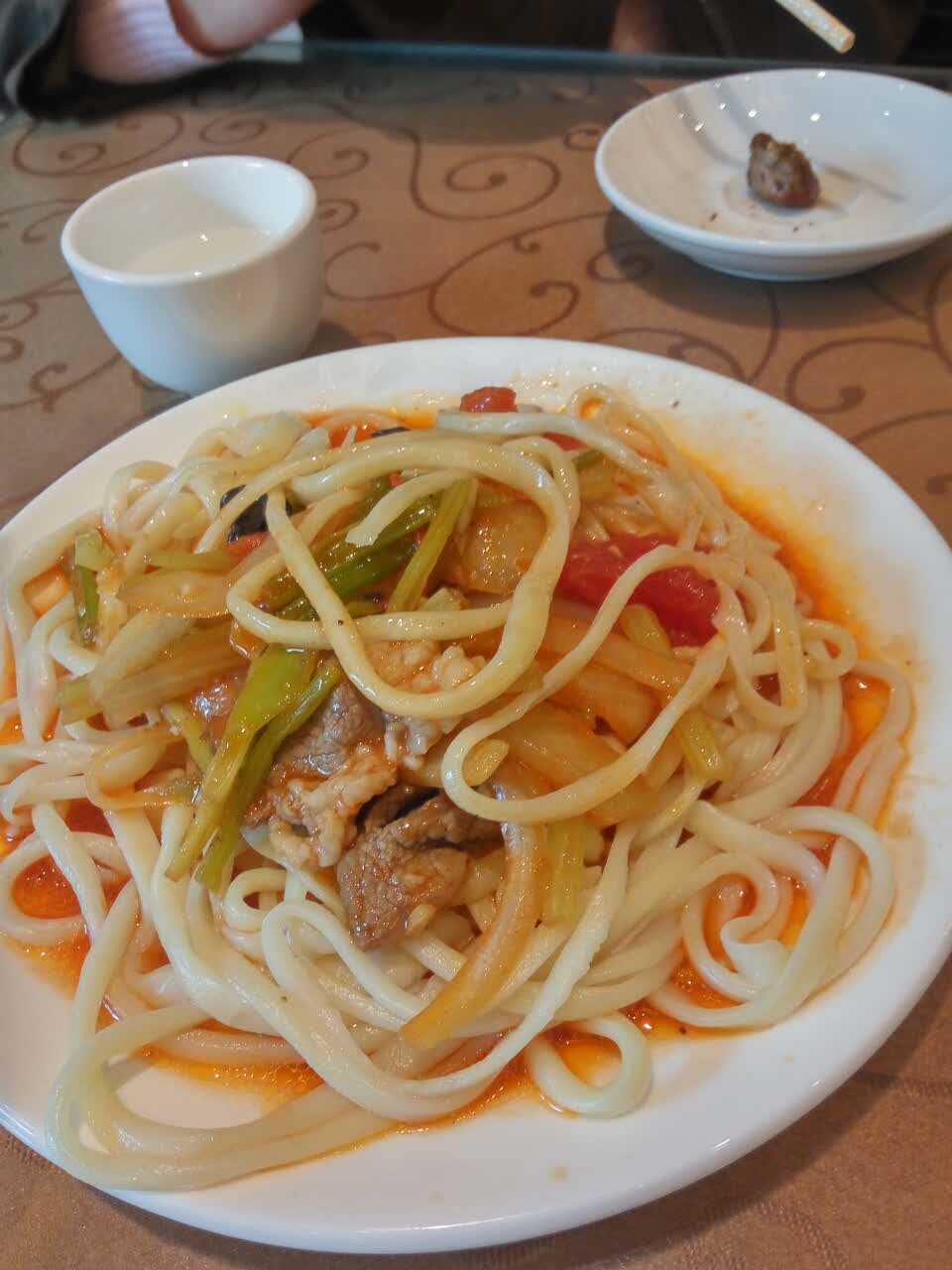 肉有点老不如腰子嫩,好吃。炒片和拉条子新疆味道浓郁,口感特别好拉条子,羊肉串,烤腰子,炒片,杏仁豆腐。炒片和拉条子新疆味道浓郁,口感特别好。烤羊肉串是大块的羊肉12一串,腰子18一串。肉有点老不如腰子嫩,好吃。