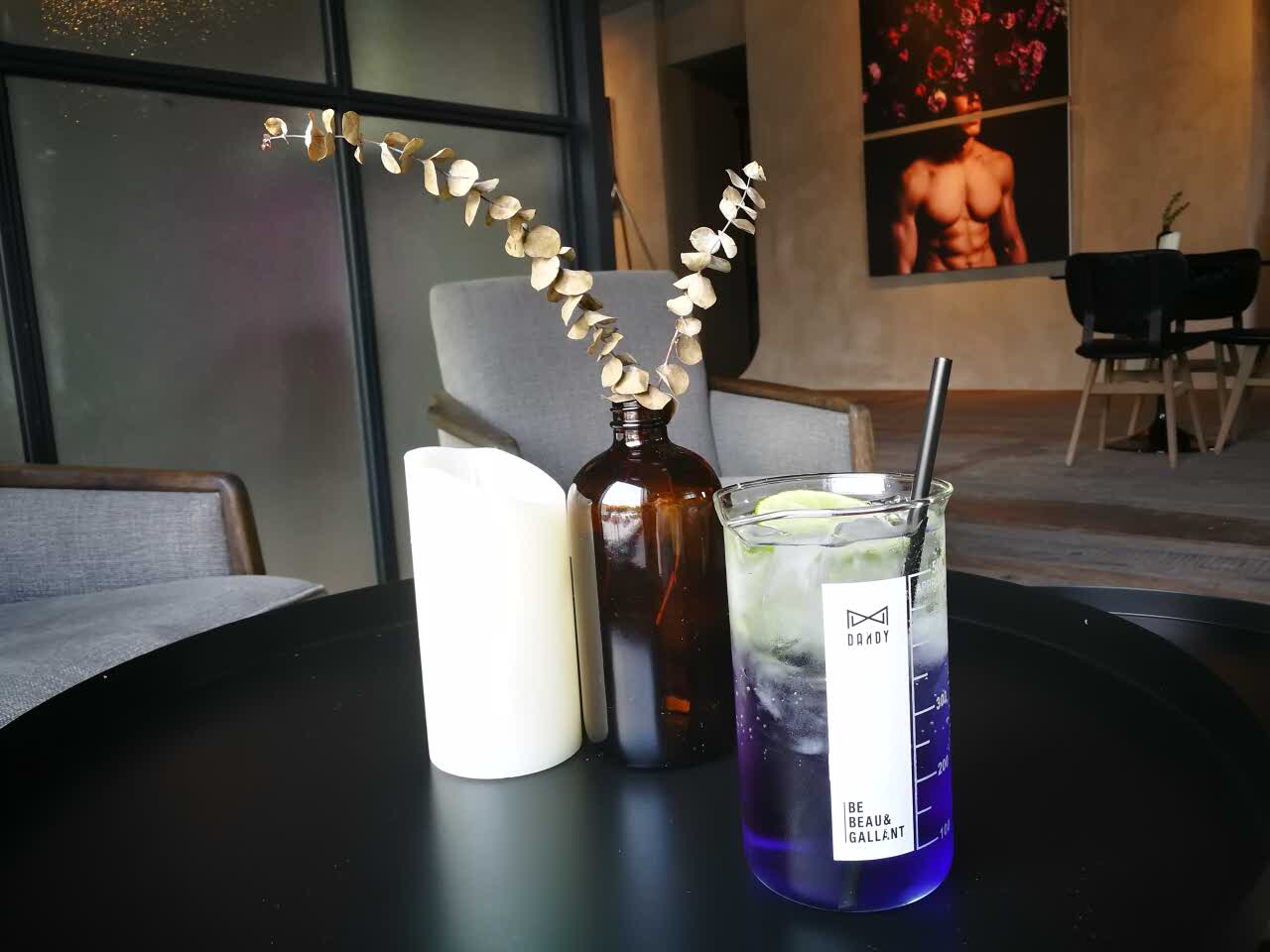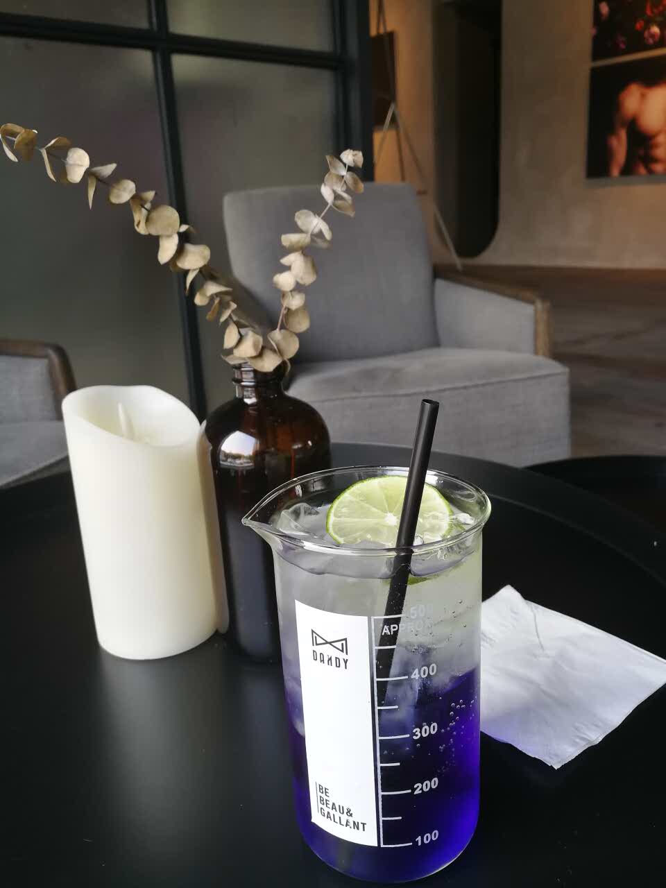 被朋友种草的店,颜值在线,服务满分,小哥哥亲切贴心的蹲下来点餐有点小感动的说。店里的简约风格很喜欢,还有墙上的画全都是我喜欢的style。独特的烧杯配上紫色的薰衣草气泡水加上两片青柠,淡淡的草本味儿,必须强推。冒着橙色预警来拔草的店果然不让人失望呀