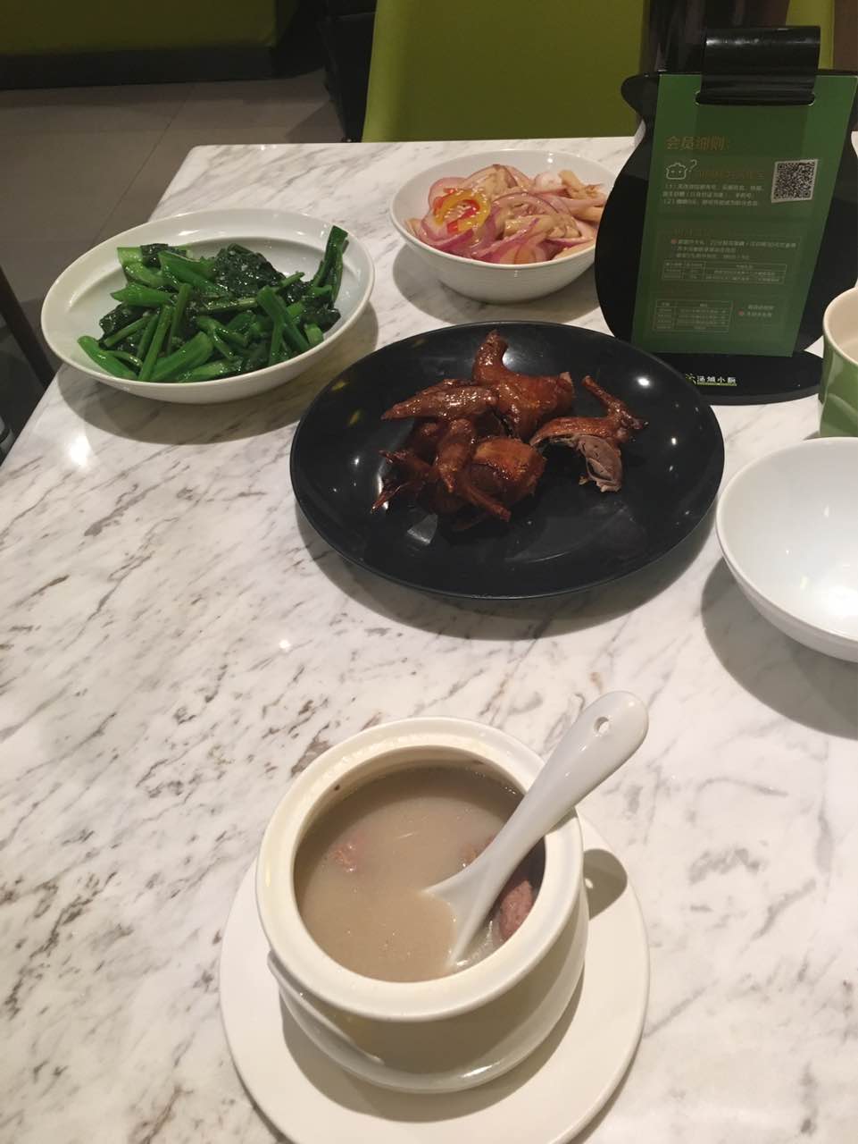 汤城小厨 一人食 真真是不能很饿的状态下点餐 特别容易见什么都想吃 也不适合吃独食 因为什么都想吃 却哪一样都吃不完...[抓狂] 所谓的海带汤 真心不好喝 还是我们天商的南区食堂 瓦罐汤好喝 这个鹅肠 很清爽 应该是有滴新鲜的柠檬汁 芥蓝 挺新鲜 然 炒锅估计没清洗就炒菜了 有抹布的味道……我的天...烧鹅 仍然是 不论哪里 肉厚的地方 肉质都不好吃 不够醇香 南瓜百合粥 好吃 然有两片百合没煮熟....山椒木耳 办会员卡赠送的 味道不佳……木瓜炖桃胶 纯粹赶潮流 尝鲜 小时候一直讨厌桃胶 粘粘乎乎的 没成想 这么一炖还挺好吃 总体感觉不佳 还老贵的 不值当 不值当