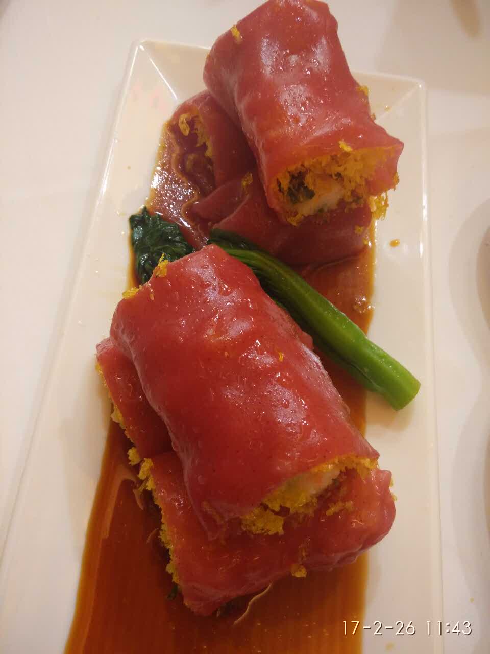 上菜速度还可以,就是虾饺好肥肥肉太多了吃一个就腻了,凤爪蒸的太烂,红米脆肠份量很大但是不好吃很油。。。烧肉好少,艇仔粥不够正宗