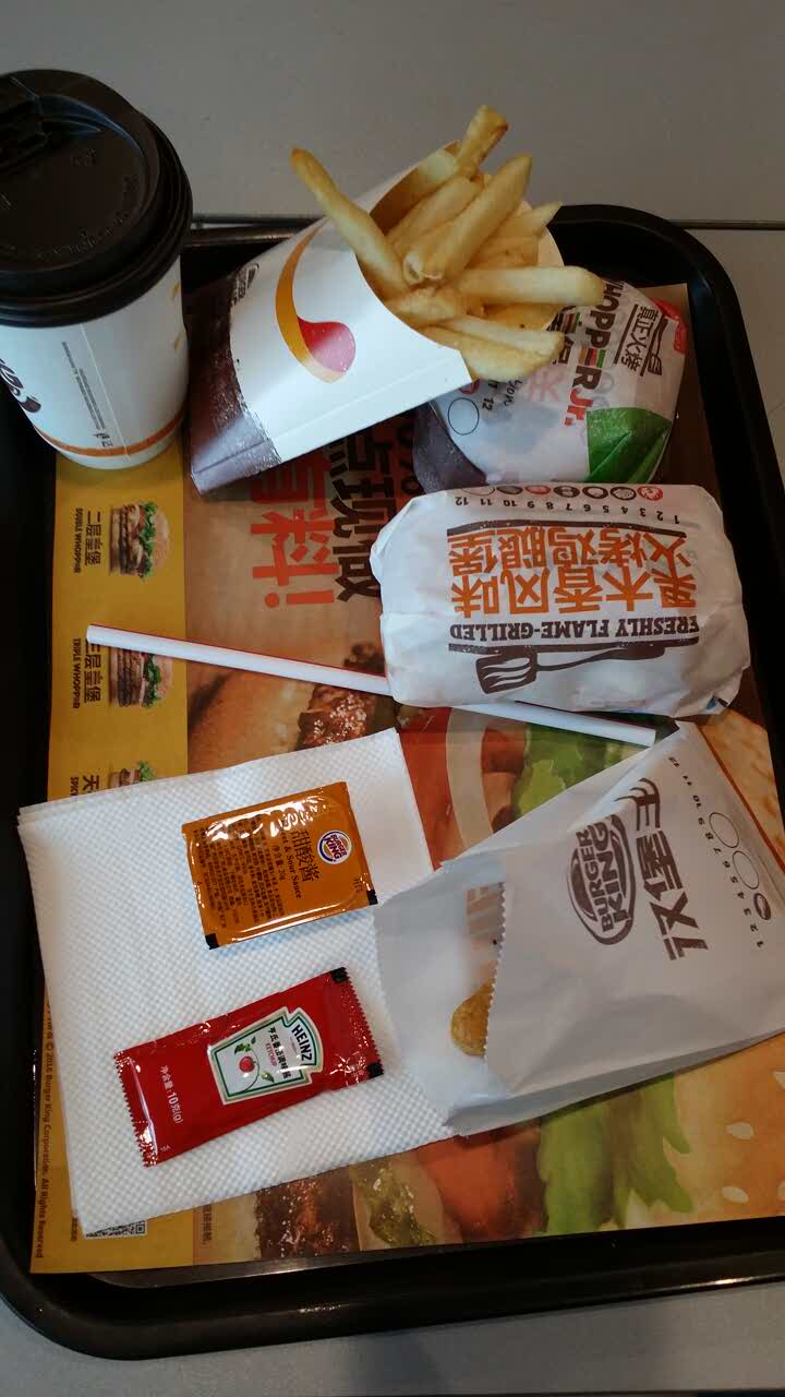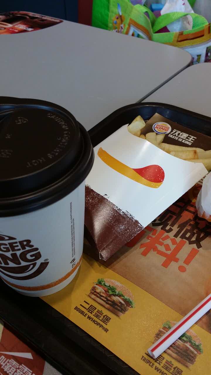 给孩子点了牛肉汉堡,我自己点了鸡肉的,汁多鲜美,薯条很酥脆,汉堡王好吃!!