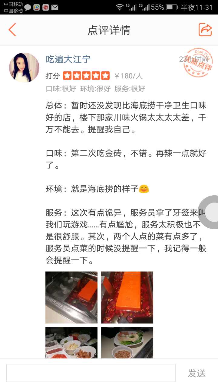 签到海底捞,支付宝付款。点评在图片里。哈哈哈。