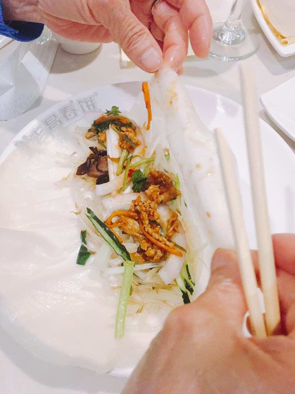 家人一起去吃了老昌春饼,很好吃,很清夾。豆芽菜,土豆丝,肉丝,肉片都不错。