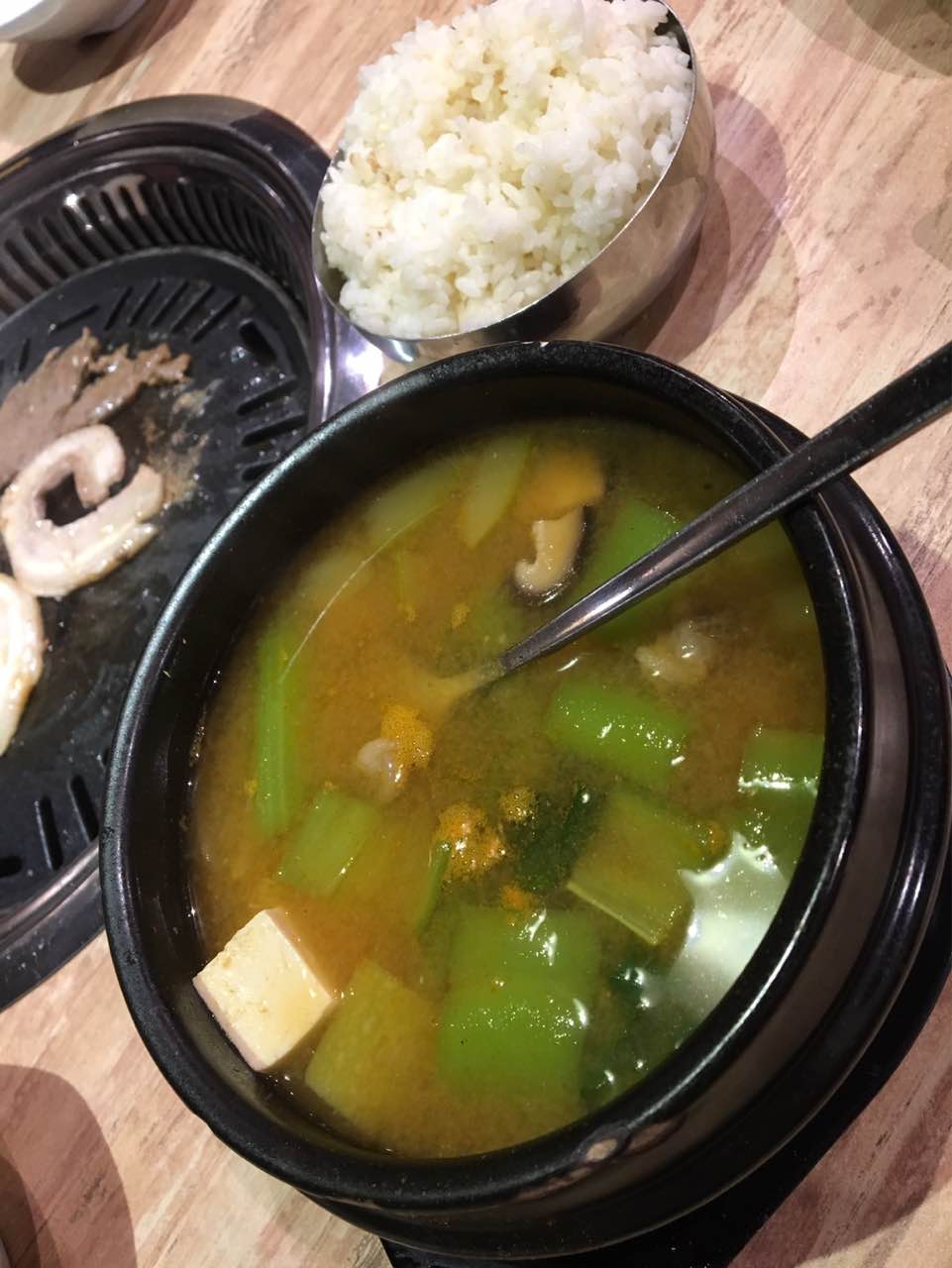 来得比较晚,人不多,不用排队,服务员换篦子很勤快,基本还没喊就来了,可惜南瓜汤没了来得比较晚,人不多,不用排队,服务员换篦子很勤快,基本还没喊就来了,可惜南瓜汤没了!小菜给的挺多,两人什锦烤拼,大酱汤,泡菜饼,够了!