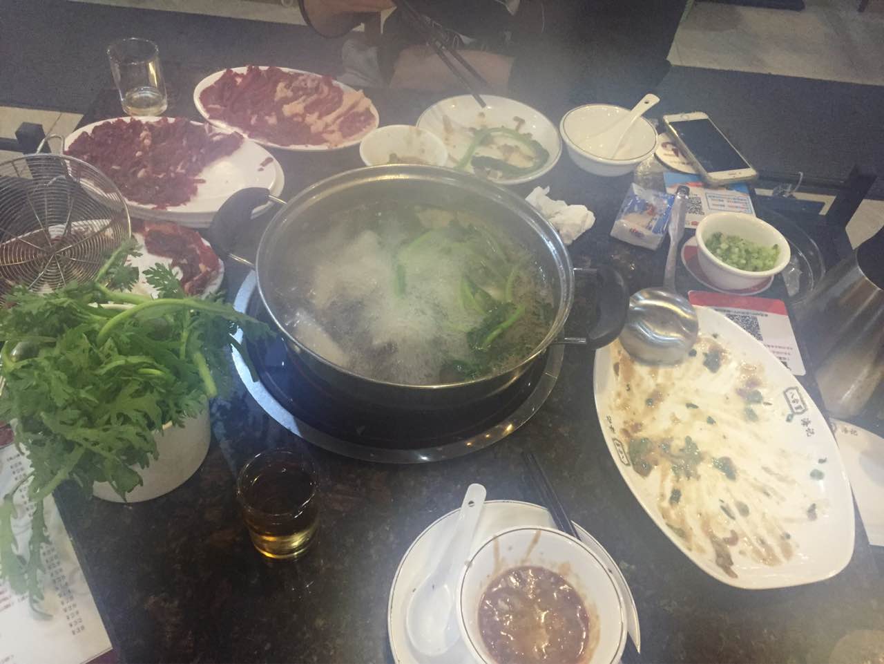 口感不错!好吃!牛肉新鲜!汤底不错!不足之处就是加单时要大声叫服务员!两个人吃五盘肉,人均105元口感不错!牛肉新鲜!汤底不错!湿炒牛河不油腻!好吃!不足之处就是加单时要大声叫服务员!本女子有点害羞,叫了几次才过来,建议装个呼叫功能键!两个人吃五盘肉,人均105元