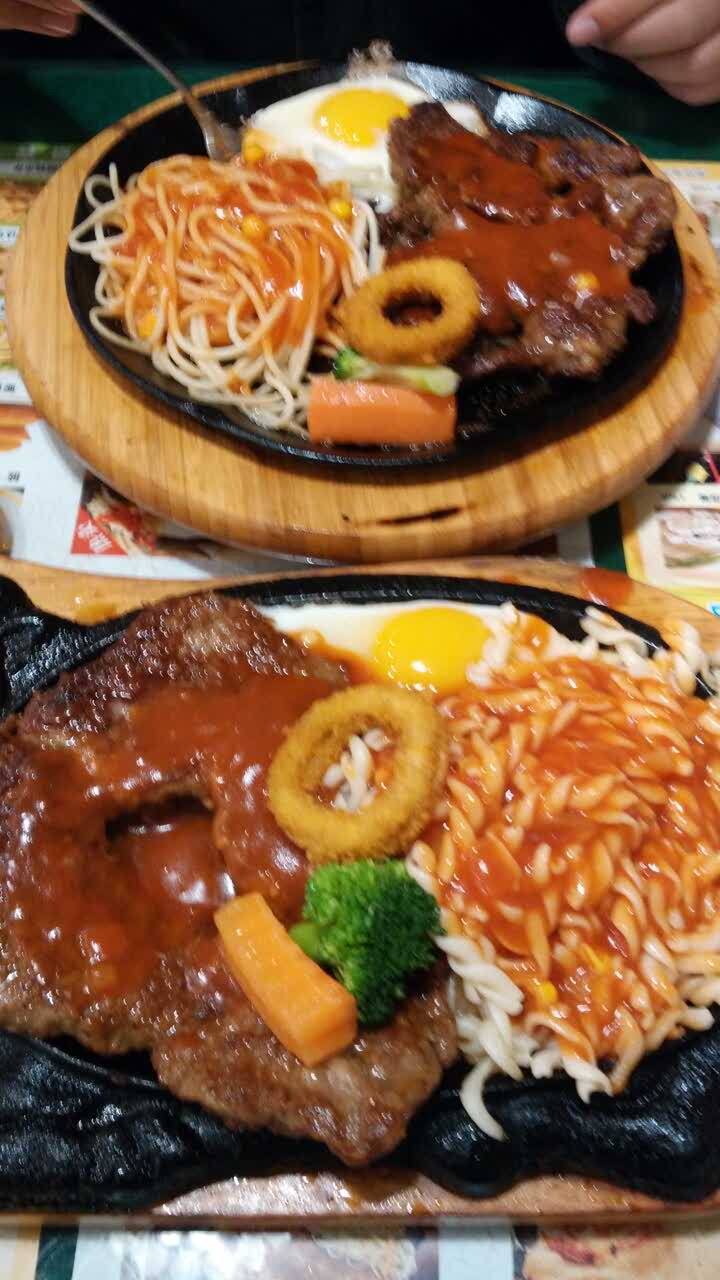 澳洲牛排和巴菲牛排味道不错,一个肉多,一个很有嚼劲儿,环境可以,还有免费自助小吃。