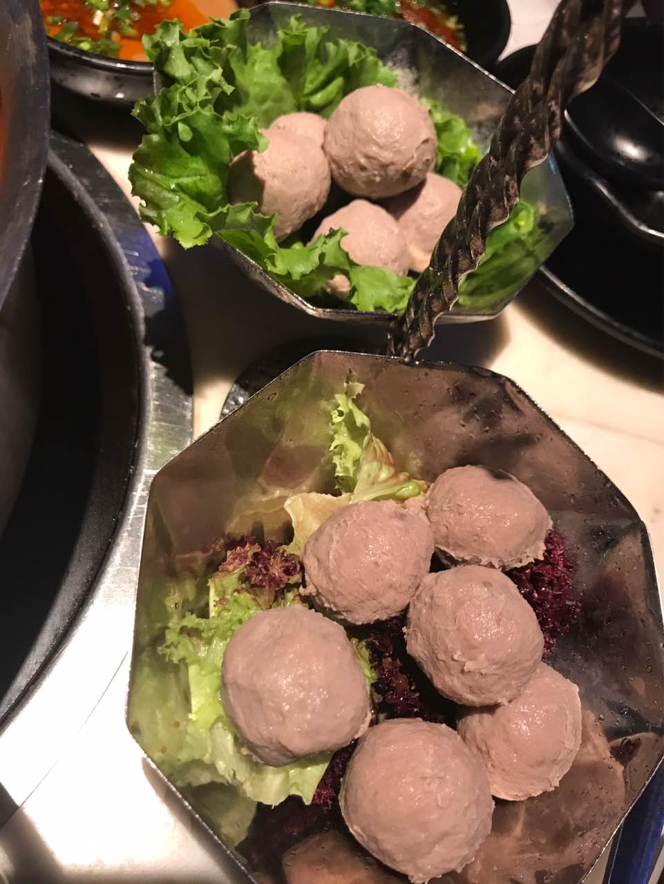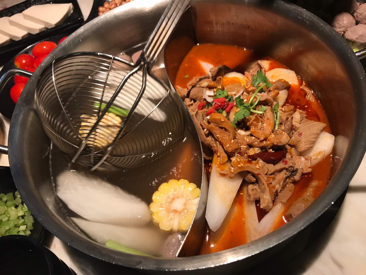 吃了牛杂鸳鸯锅,觉得不错,牛杂特别软,十分好吃。潮汕口味火锅。另外,还有番茄和黄瓜吃