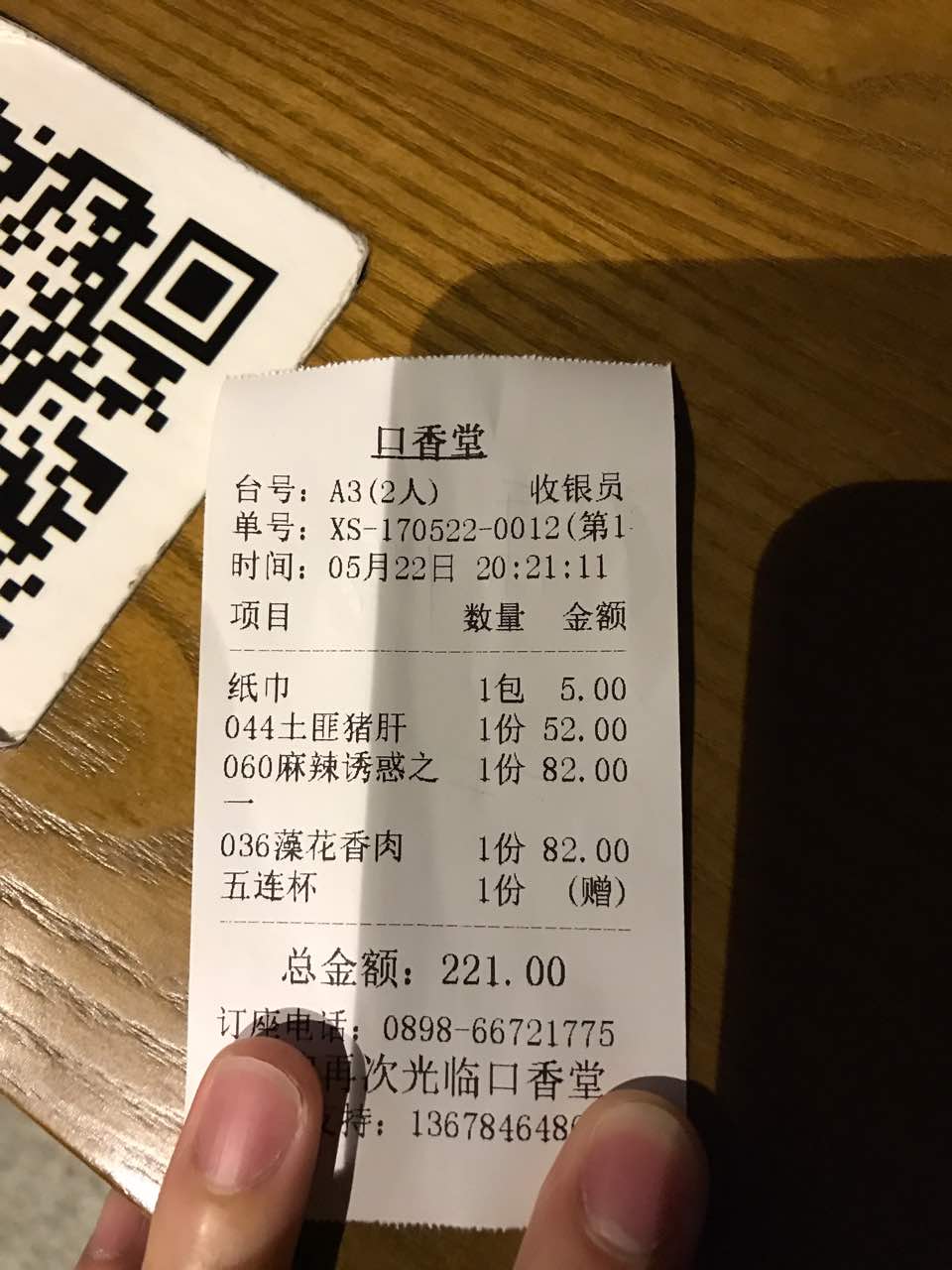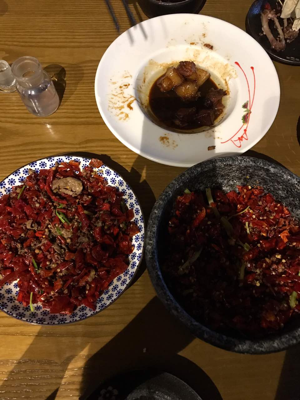 猪肝干。红烧肉皮散油松肉又柴,总体就是咸。鸡翅炸到可以当武器,皮硬肉干味道靠皮上的辣味来充数。唯一值得感动的是,辣味麻味没混在一起。点的秋葵一直没有上,到埋单了也还没上,请问客官老爷秋葵变甜点了嘛?一顿饭吃了二百多三个菜真肉疼啊…穷人家孩子以后还是别来了…