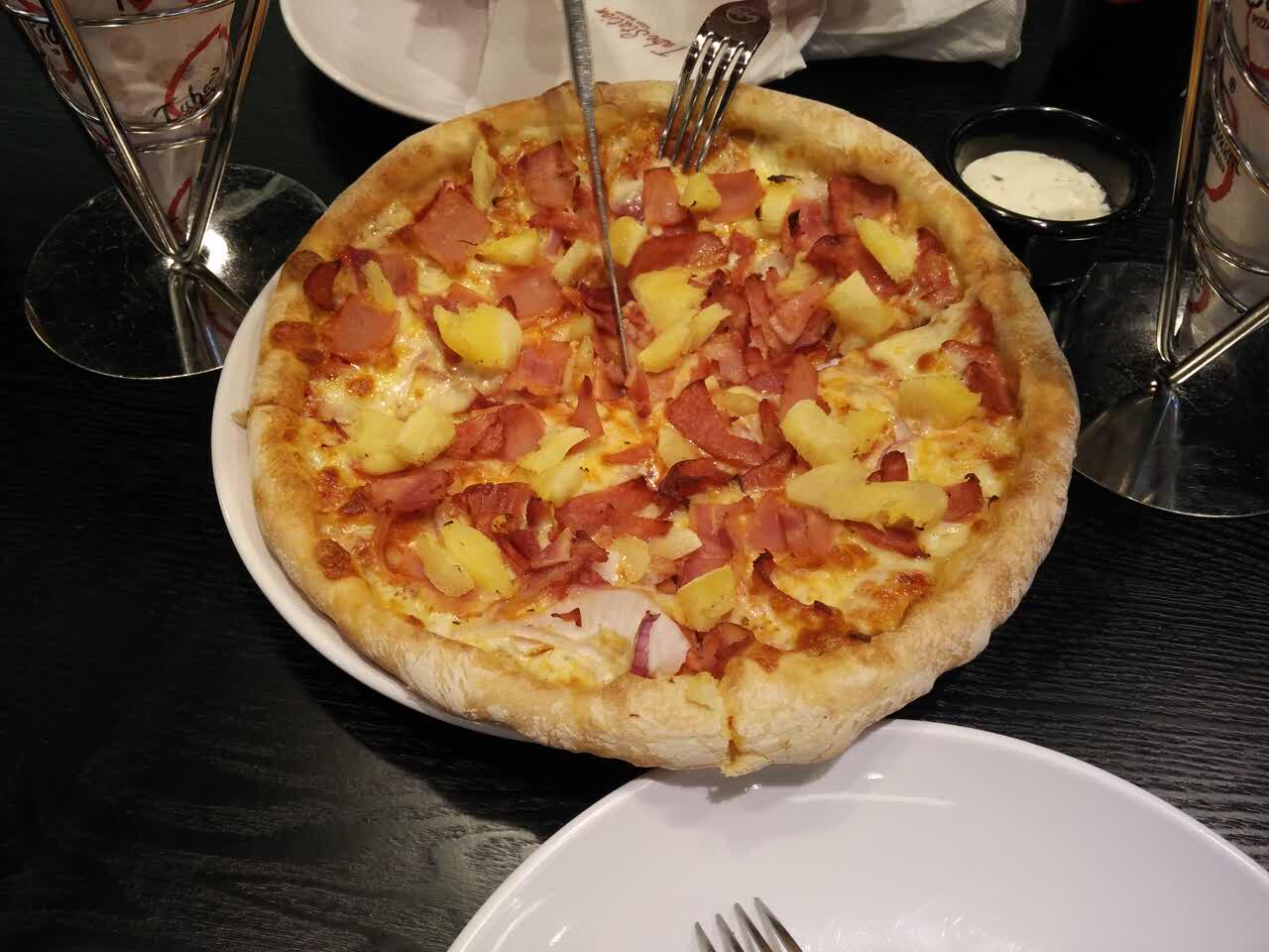 还不错,薯条比较好吃,夏威夷的披萨小分量很足,两人足够了。