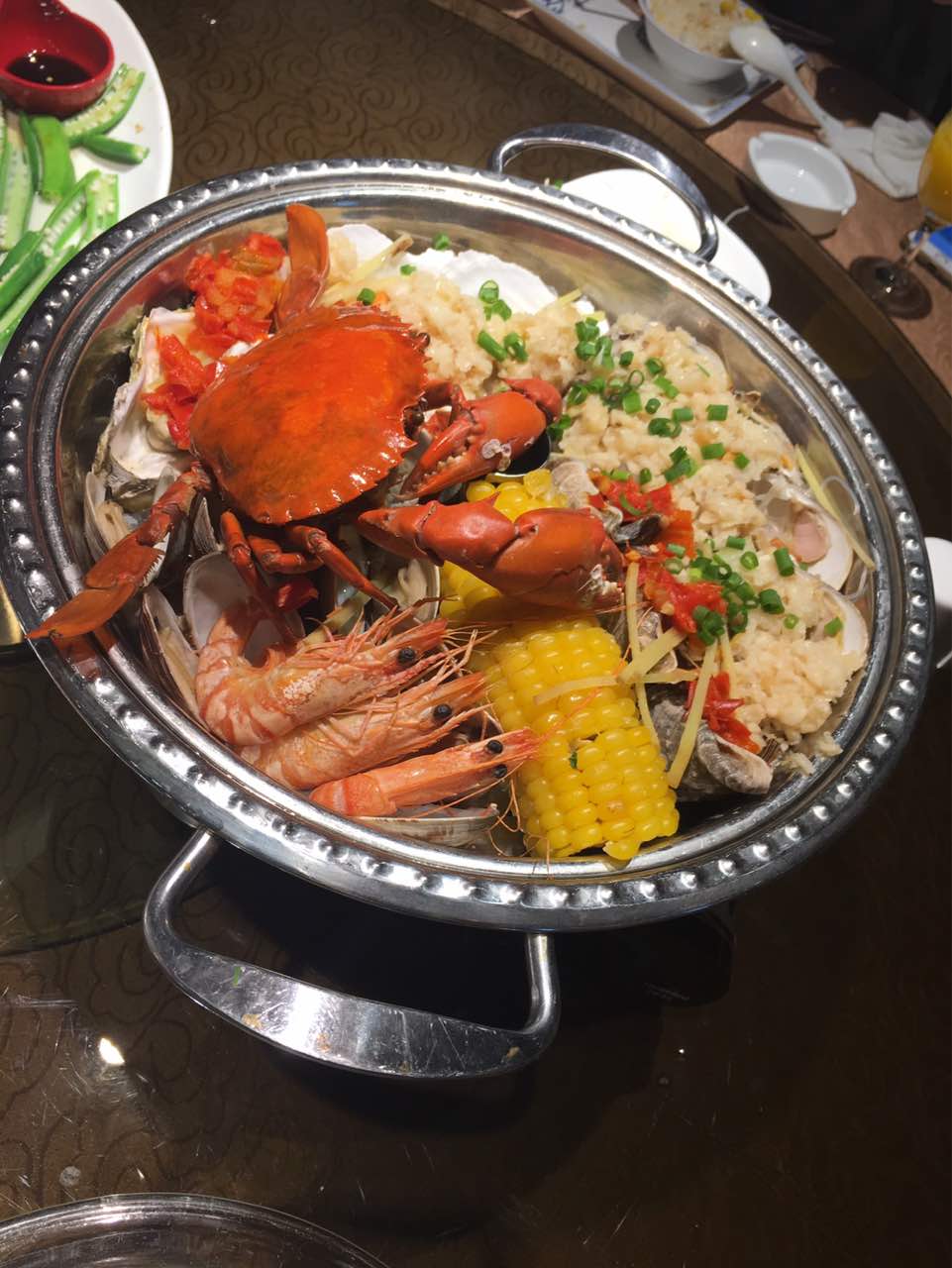 环境不错,上菜也很及时,海鲜蒸锅扇贝的粉丝糊了,招牌卤鸭必点!