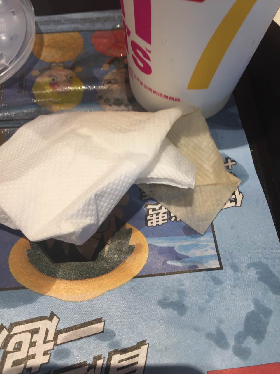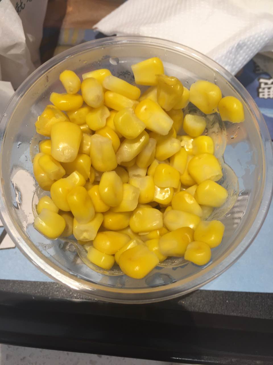 可乐拿出来的时候泼在盘子上好多,餐巾纸都湿了,而且只有一张纸玉米杯没味道,不知道是不是忘了加沙拉酱,反正比我在南京和上海吃的味道都差。可乐拿出来的时候泼在盘子上好多,餐巾纸都湿了,而且只有一张纸。总体一般吧,主要附近也实在没什么吃的地方