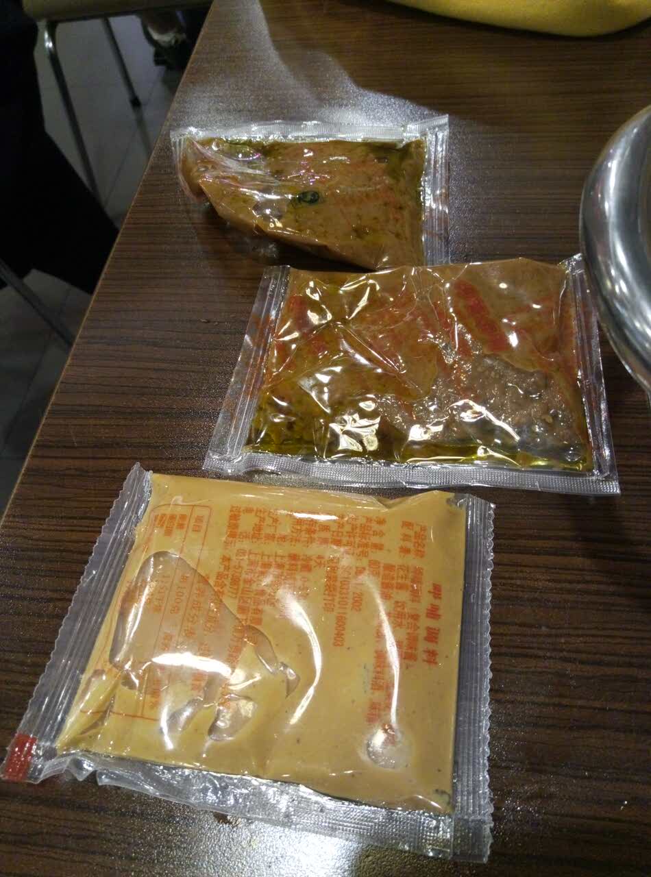 点了94.8元,两个人吃的,锅底很便宜,才5+6=11元,点了一个超级辣的锅底,另外一个番茄锅,哈哈,两个人都很能吃辣。调味料是袋装的,不是自选的,也挺不错的。本来只有两包的,那个服务员说另外一包送我们尝尝。