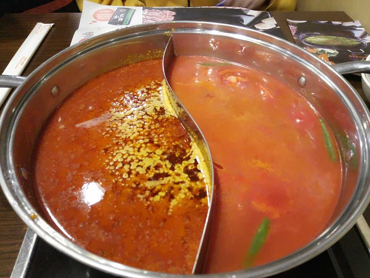 ...的,锅底很便宜,才5+6=11元,点了一个超级辣的锅底,另外一个番茄锅,哈哈,两个人都很能吃辣