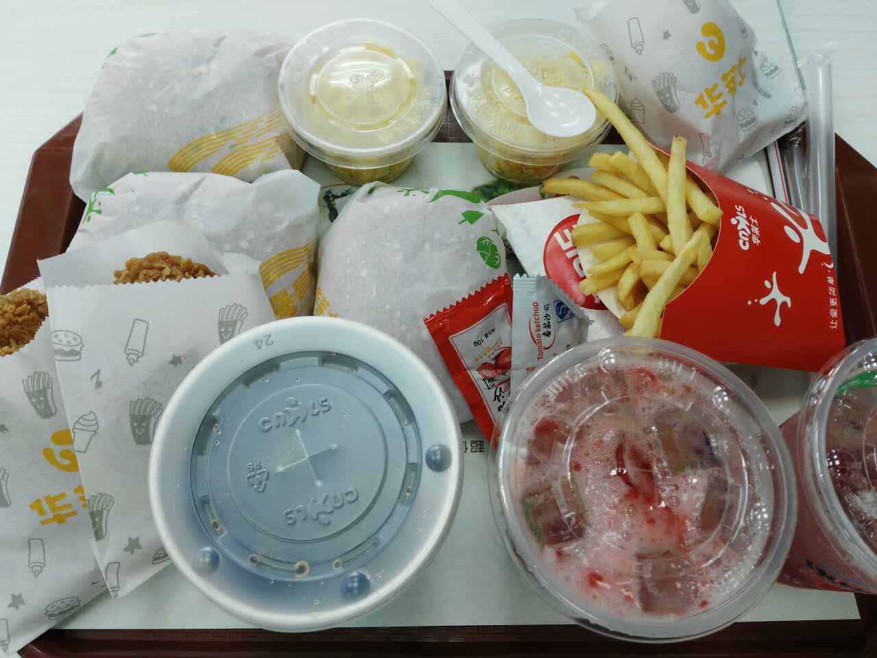 今天带着外甥来吃汉堡,七十几块钱买了好多,两孩子一人一杯玉米