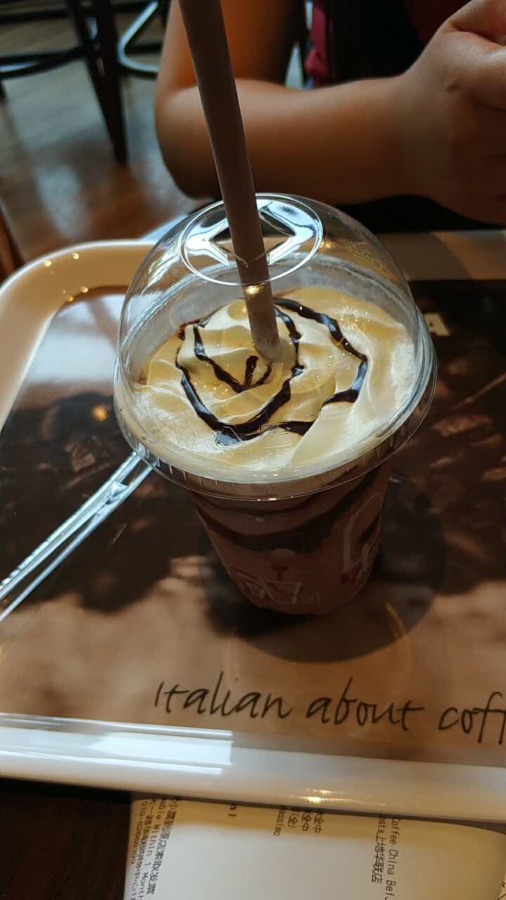 还不错,两个人。一杯冰美式,一杯榛子巧克力,很冰,很舒服,外面热,喝急了想咳嗽。