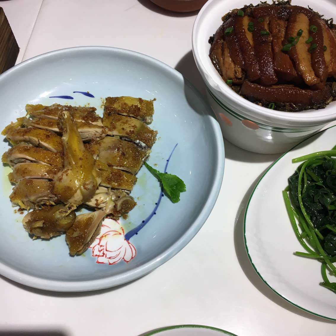 地瓜叶稍微有点老了不过还是可以的。菜干扣肉和酿豆腐的确在水平在线,扣肉肥而不腻很棒,豆腐也很滑嫩菜干扣肉和酿豆腐的确在水平在线,扣肉肥而不腻很棒,豆腐也很滑嫩。表面是焦的。地瓜叶稍微有点老了不过还是可以的。盐焗鸡肉有点柴,一般般。