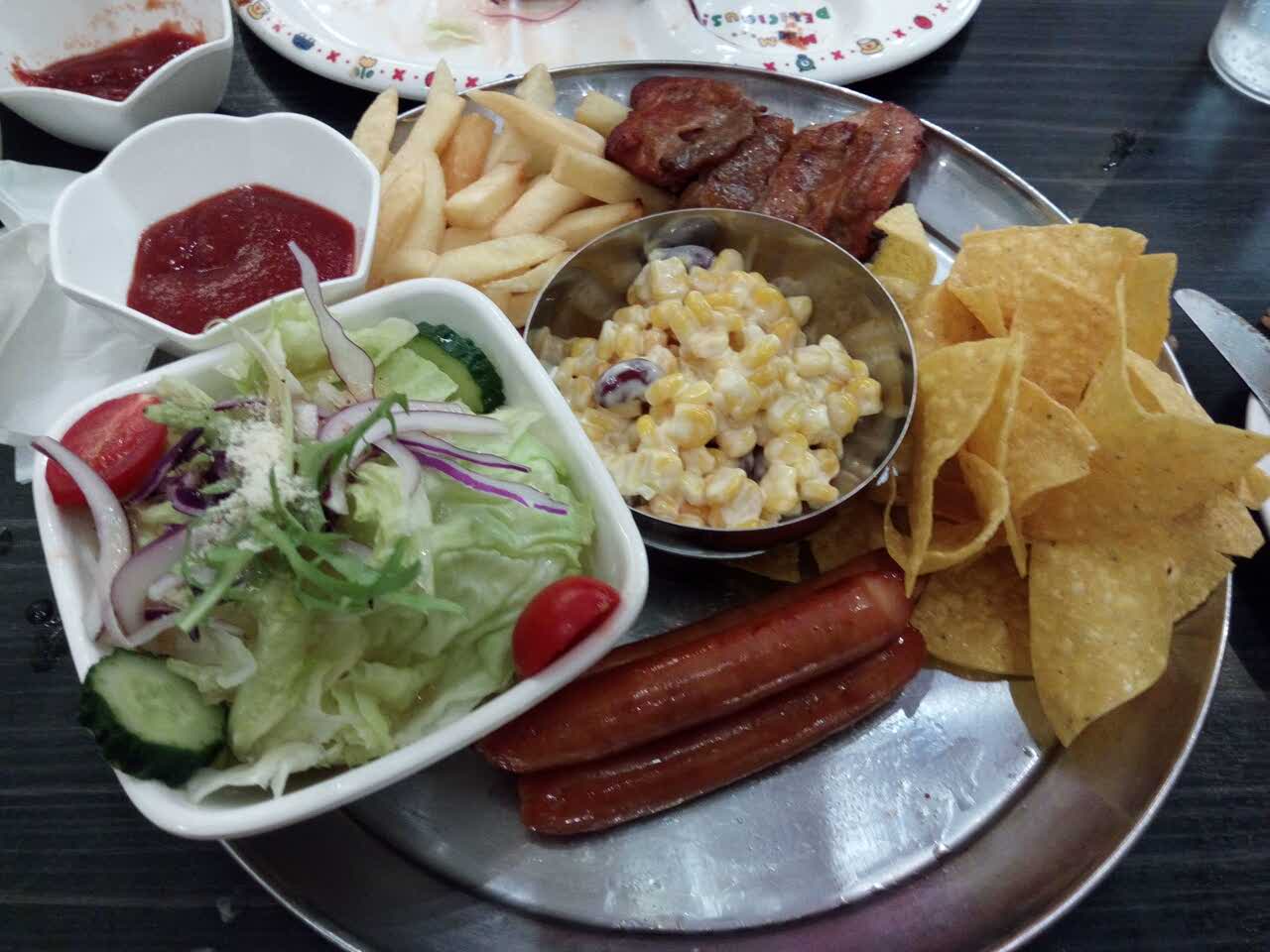 卖相不错,口味就一般般啦,没想到还等座,进去一看是二楼的营业面积没开放,只有一楼十几张餐桌。儿童套餐的牛肉饼味道怪怪的,不好吃。大拼盘的薯片基本嚼不动,其他东西还可以,毕竟价格不贵。最值得点的就是啤酒,十五块一大瓶640毫升朝日,口感比较好。