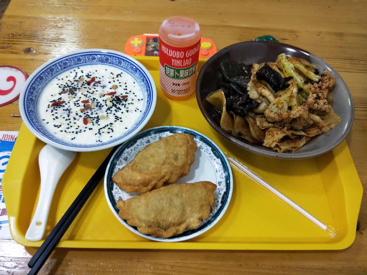 牛奶鸡蛋醪糟很好喝,正好解麻辣,洋芋格格挺香的,好像里面有洋葱沫。胡萝卜汁清爽,有种小时候冰棍的味道洋芋片脆生生的,豆皮很软糯,配了几串蔬菜,香辣味正好。牛奶鸡蛋醪糟很好喝,正好解麻辣,洋芋格格挺香的,好像里面有洋葱沫。胡萝卜汁清爽,有种小时候冰棍的味道