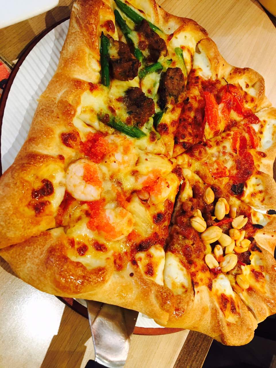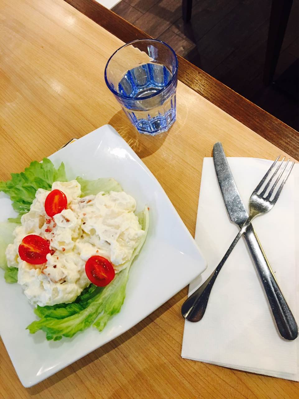 土豆沙拉看起来就么有食欲啦,建议外形改造一下。四拼披萨很不错哦哦,凤尾虾炒鸡好吃