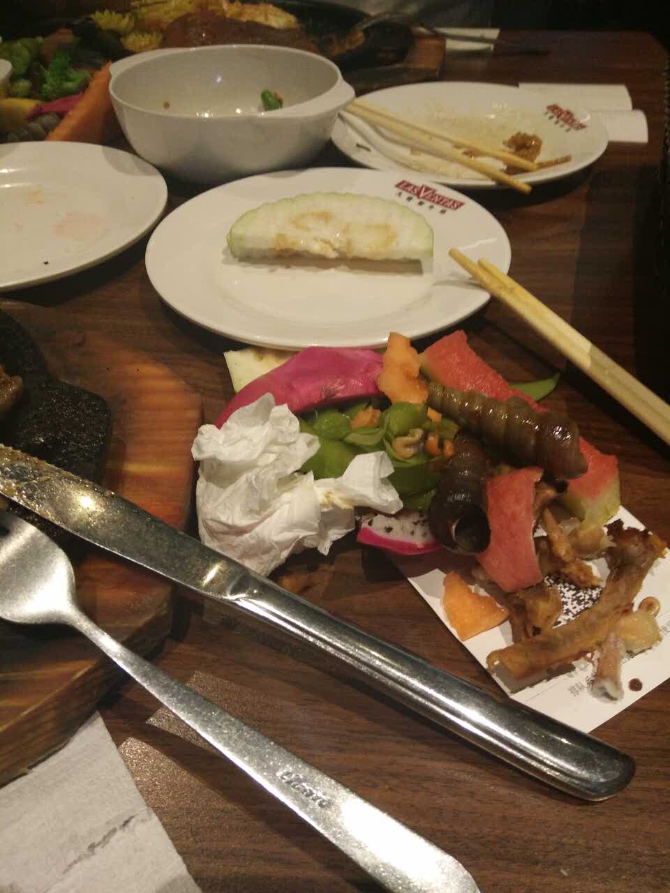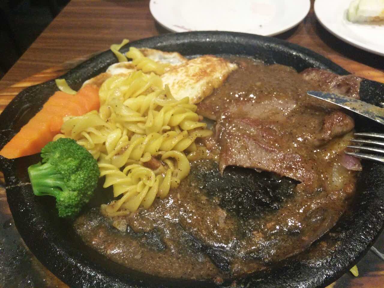 今天周末,人很多,等了好久,吃自助吃到吃不下了才上的牛排,火焰牛排很薄但是口感还可以