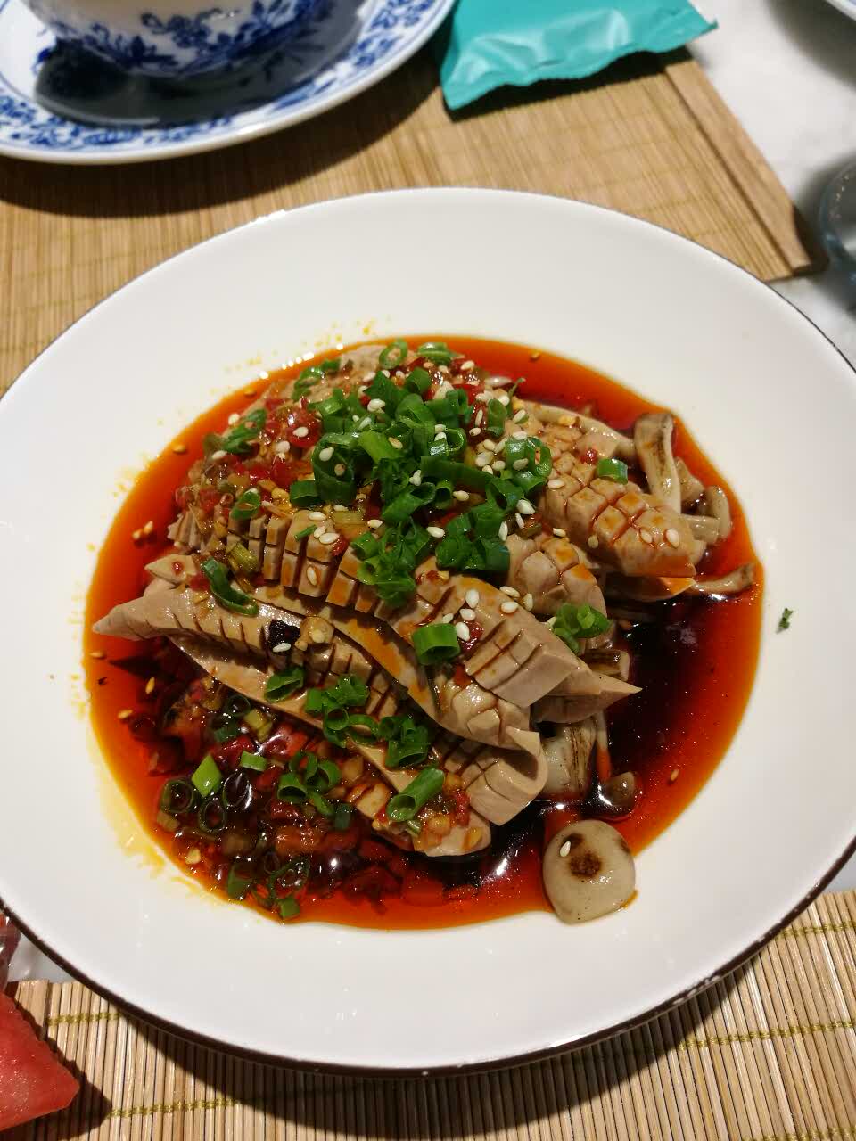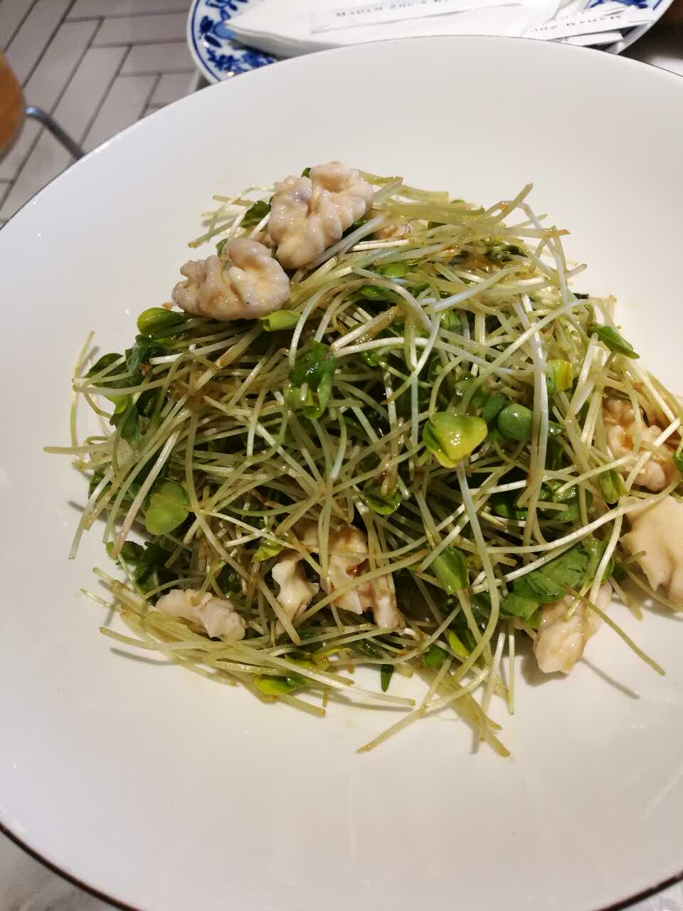 养生鲜桃仁,桃仁太少,都是菜,不过很爽口,红油菌菇腰花,很不错,烤鸭三吃,片皮沾糖,美味,就是油腻了点,不能多吃,还有包饼吃,鸭架加20元可以选择椒盐煲汤或者泡饭,味道很好,就是没有半只可选择,两个人吃太多了