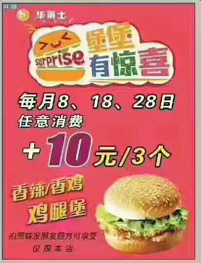 每月8号 18号 28号即可享受10元3个鸡腿堡。10元3个鸡腿堡。10元3个鸡腿堡