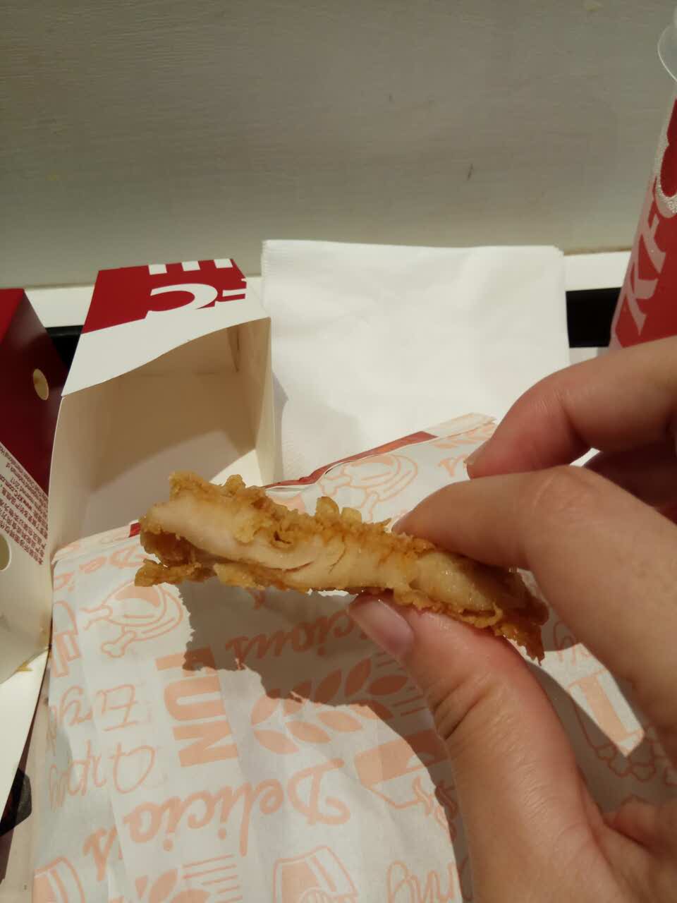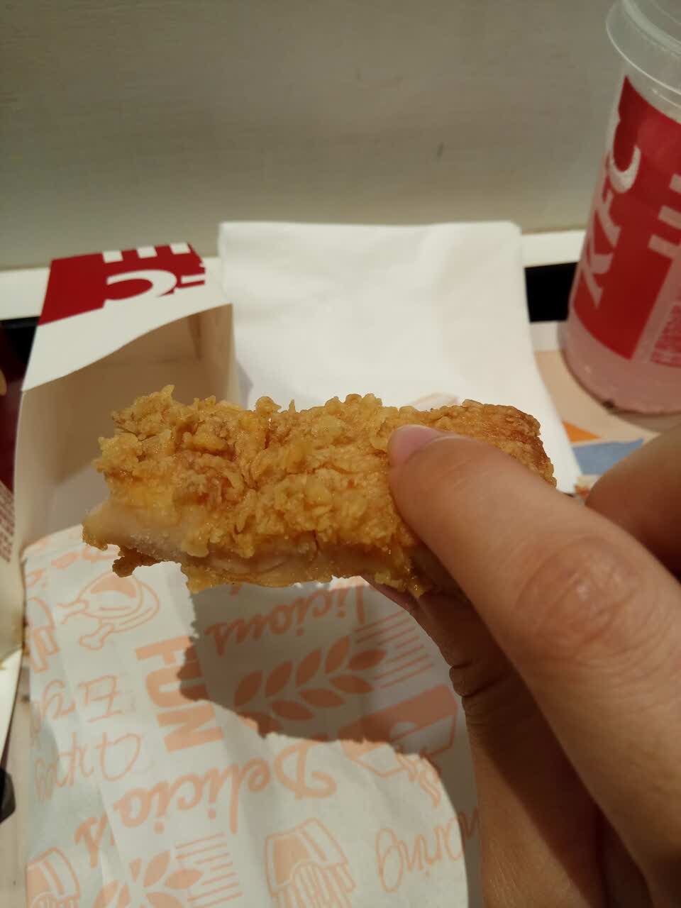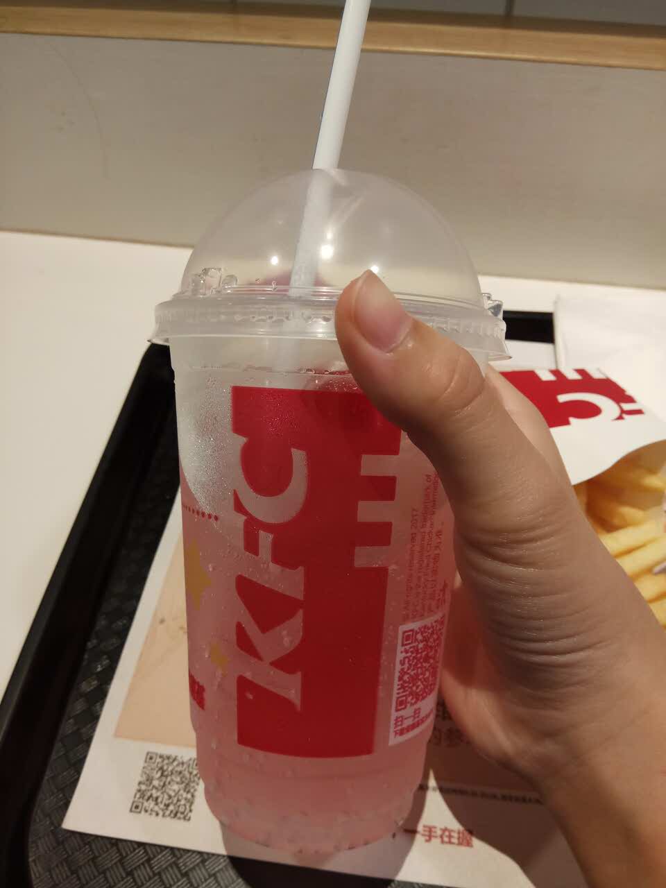 藤椒鸡扒像隔夜的,又硬又柴,还是切开的,差评!粉色百事可乐其实是水果味汽水,不过很好喝