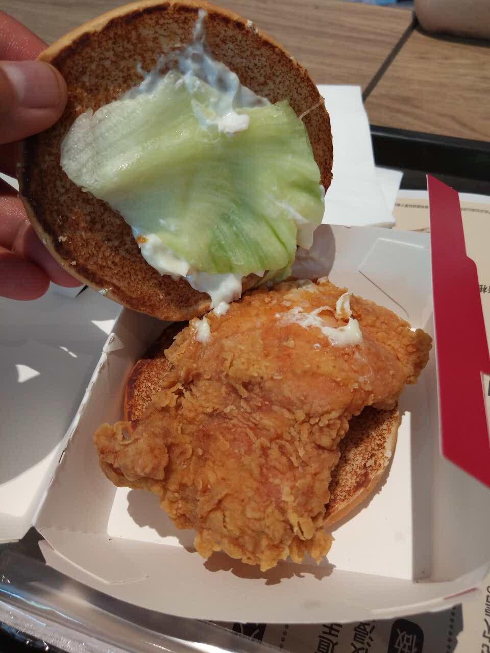香辣鸡腿堡有点偷工减料,菜叶少的几乎看不到,其他的还算中规中矩吧,能吃东西就行。
