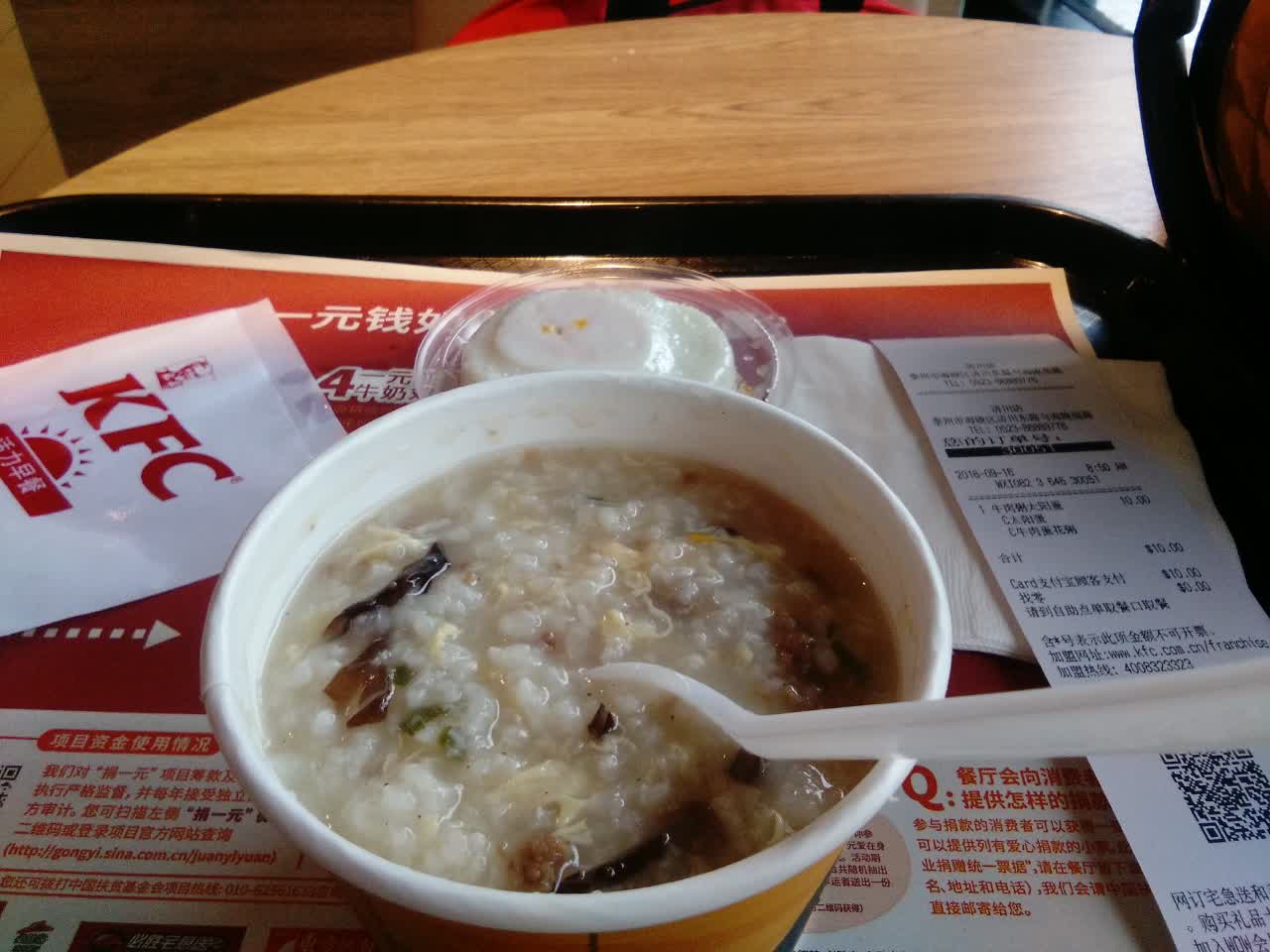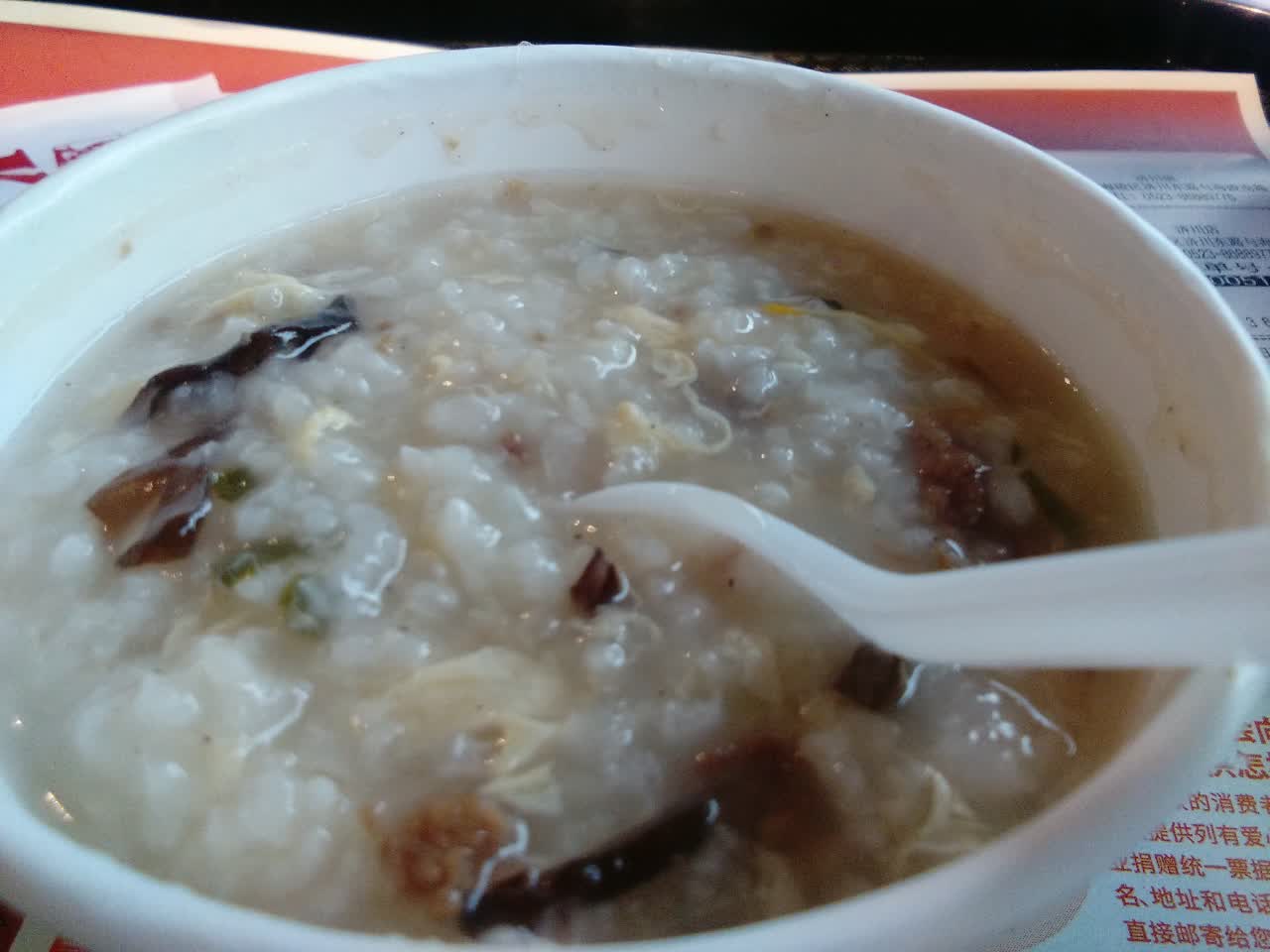 今天下着大雨,人不是很多。东西还是很好吃的,今天换了个牛肉蛋花粥,以前重来没吃过,今儿试一下。