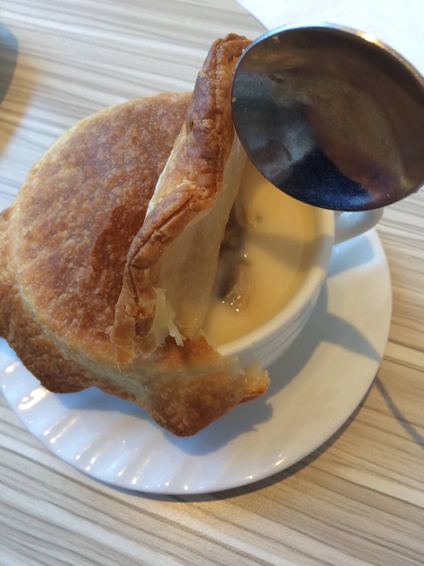 酥皮奶油蛤蜊汤,真的好好喝。黑椒牛排也还可以,但肉香味不足。基本可以接受,服务也好,主动倒水~