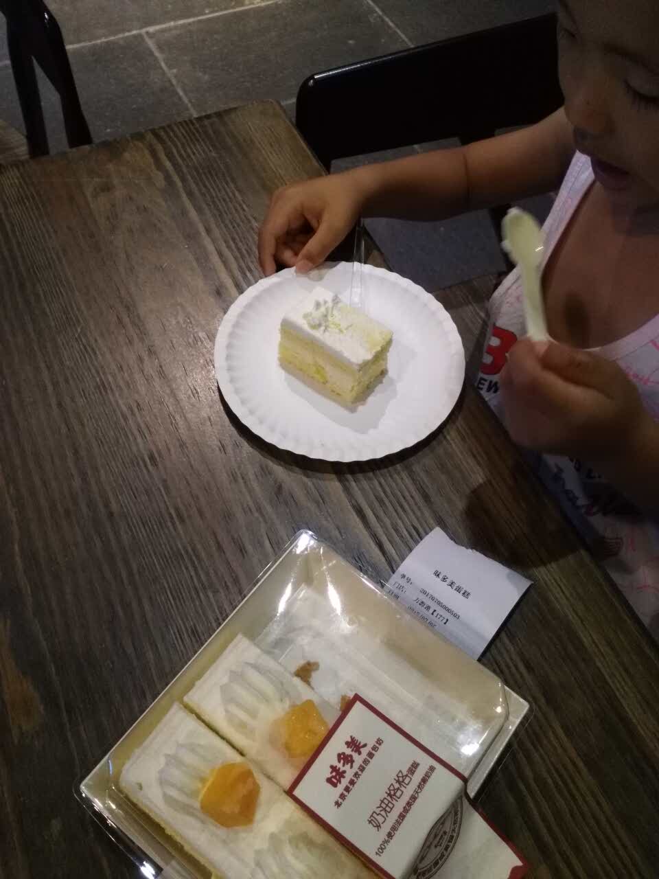网友2017-07-05收银姐姐也很好,看带着两个宝贝,主动拿了双份餐具刚买完,两位小主迫不及待开吃!就是晚上来的有点晚,只有这一种切块蛋糕了,但是味道还是不错的。收银姐姐也很好,看带着两个宝贝,主动拿了双份餐具!
